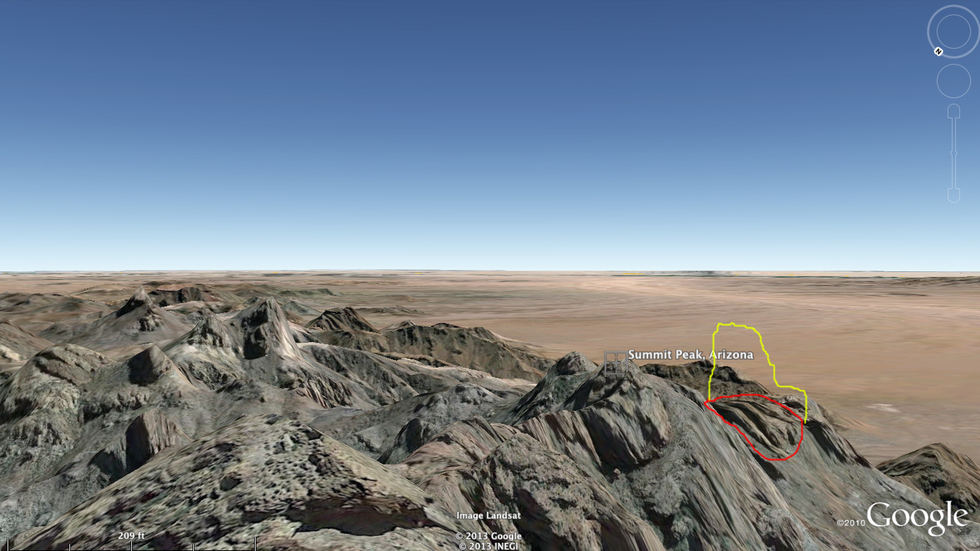 In this Google Earth view from the top of Ten Ewe peak, you can clearly see the shadow of the spire from the aerial photograph, but the spire is nowhere to be seen due to it's absence from USGS topo maps! See this photo to compare: http://hikearizona.com/photo=397871