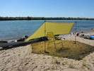 The water is very pretty, and the river was high, and running fast. We had a good run of it all day, with stops at several nice beaches. The beach where we camped was not far upstream from McIntyre Campground, another Riverside County park. It was hot on our beach in the late afternoon, and this was the only shadeless campsite we had on the trip. I set up my tarp, using my kayak and two hiking poles, and made a nice place to set our camp chairs. As soon as the sun went down it cooled off a lot.