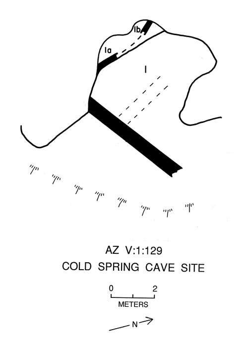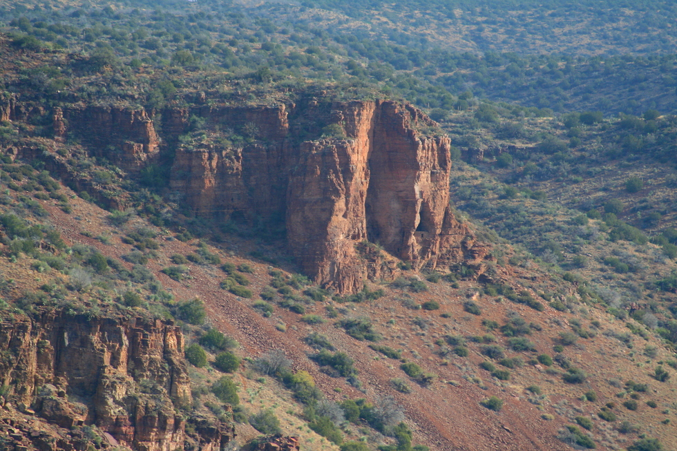 After several similar expeditions into the Sierra Ancha, Haury published his findings in 1934 as Gila Pueblo Medallion Paper #14. His seminal publication, "The Canyon Creek Ruin and Cliff Dwellings of the Sierra Ancha," was published later in the same year. You can connect to the past by viewing the remains of the Peterson Ranch near Aztec Peak. The Ellison Ranch is still a going concern within Cherry Creek Valley. Many of my favorite Cherry Creek hiking destinations are documented in Dr. Rich Lange's recent publication, "Echoes in the Canyons - the Archaeology of the Southeastern Sierra Ancha," celebrating the 25th anniversary of the Sierra Ancha Project (SAP). The SAP began in June of 1981 from a small grant by the University of Arizona Research Office to verify and update site information originally cataloged by Gila Pueblo. It soon became clear that the project's original scope was more extensive than anticipated as many new sites were discovered, and the project was stitched together piecemeal over the first 25 years of operation. One of the first major undertakings of the SAP was a main beam replacement in Cold Spring Canyon site V:1:136. Insects and water severely damaged the main roof beam, and the structure was in danger of complete collapse. In late October of 1983, a replacement beam was dragged up the old mining road by a horse. A pulley system was used to transport the beam up the scree slopes from the abandoned mining road trail to the terrace ledge near the cliff dwelling. It took four people to accomplish the final task of lifting the beam across the terrace ledge and into position within the cliff dwelling. When one ponders the magnitude of the task in the present day, you have to marvel at the determination of 700-year-old civil engineering to construct these Cherry Creek cliff dwellings. Other examples of Cherry Creek cliff dwellings have been documented within HAZ hike descriptions for; 1. Moody Point Trail #140 Moody Point Trail #140 on 2006-11-14 2. Devil's Chasm Devils Chasm on 2006-03-04 3. Cooper Forks Cyn Cliff Dwellings Cooper Forks Cyn Cliff Dwellings on 2005-09-17 4. Pueblo Canyon Pueblo Canyon Ruins on 2004-09-05 I'd like to add Cold Spring Canyon as another example of Cherry Creek cliff dwellings to the HAZ collection of hike descriptions featuring ruins. To further pique your interest, there is a remarkable mining history associated with this trail (after all, it does follow an abandoned mining road). The Big Buck Uranium Mine operated from 1954 to 1957 and is located between Devil's Chasm and Cold Spring Canyon west of FR203 at the end of the abandoned mining road. Blue Rock and Grindstone prospect deposits are also located along the abandoned mining road. The Hike From our campsite near Devil's Chasm at FR203 continue north along the Forest Road about 1 1/4 miles until you cross Cold Spring Canyon Creek. As the Forest Road bends to the east out of Cold Spring Canyon, you will notice an abandoned mining road crossing FR203 in both directions. This is the trailhead to Cold Spring Canyon and Pueblo Canyon. Follow the steady incline of the abandoned mining road constructed in 1954 to service the Big Buck Uranium Mine. Footing can be a challenge as the old road surface is comprised of ankle-rolling "baby-heads" (~6-inch diameter rocks). After completing the first quarter-mile and rising about 500 feet, take a break at the campsite remains near the Sierra Ancha Wilderness boundary. The trail will veer to the west, crossing the wilderness boundary while maintaining a steady assault on elevation gain. Around the half-mile mark, you will pass a house-sized boulder on your left. At the three-quarter-mile mark, you will pop out onto a flat terrace with a distinctive petroglyph-marked boulder on your right. The trail splits here. The trail ascending to the west takes you to Pueblo Canyon. The relatively flat trail to the south takes you to Cold Spring Canyon. Take note, if you are ascending to the west, you are on the wrong trail! We managed to take a wrong turn here but quickly recovered... The flat terrace near the Pueblo Canyon trail junction has a vista view of Cherry Creek valley. If you examine the cliff face directly to the east, you will be able to pick out the Cooper Forks cliff dwellings. Continue south along the remains of the abandoned mining road towards Cold Spring Canyon. The trail will veer to the west when it reaches the edge of the canyon. At this point, the trail will contour slowly downhill towards a dry waterfall crossing Cold Spring Canyon. Carefully scan the cliff face in front of you on the north side of Cold Spring Canyon. Look for a distinctive crack in the cliff wall forming a cave. This is the V:1:136 site described by Haury and Lange, or the more memorable name "Crack House" assigned by our hiking party... At the time you make one of the first sightings of the "Crack House," there will be a scree rock slide covering the abandoned mining road. The mining road trail becomes considerably more overgrown past the scree rock slide. Note this, as you will ascend the scree upwards towards the "Crack House". This section is nothing short of NASTY. Century plants will gouge you, prickly pear needles will penetrate you, and dust will fill your lungs. The climb is reminiscent of the scramble up to Devil's Chasm cliff dwelling. You will climb about 250 feet until you reach the cliff face. The intermittent trail will contour along the cliff face until you reach an exposed dry waterfall "punchbowl." Traverse the punchbowl heading towards a clump of trees hiding the cliff dwelling entrance. Upon passing the clump of trees, you are rewarded for your efforts! There are poles strategically located to allow entrance into the cliff dwelling. Once inside, there is much to explore. There is also a balcony view of Cold Spring Canyon. From the "Crack House" ruins, you have a clear view of the abandoned mining road traversing the south side of Cold Spring Canyon.