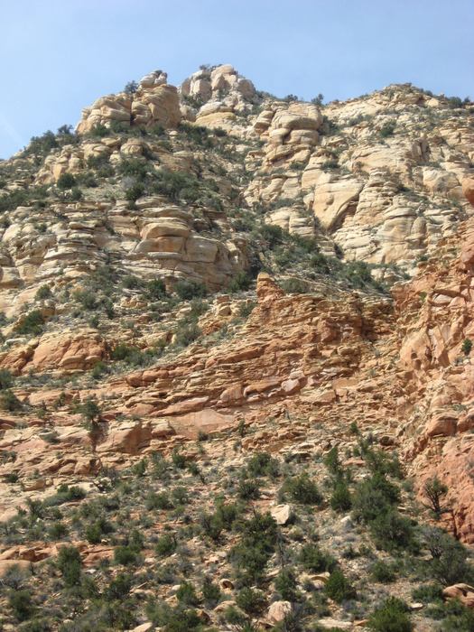 The next part of the climb is mostly class 2, and the trail is hard to follow at times. The general path initially continues west before turning back east, and your path may weave uphill irregularly. If you are following a trail but unsure, look for one of these two small climbs: A or B. Either one will be closer to the viewpoint than the end of the far switchback, and both will take you up to the view point which is just before you meet the rough trail coming up from the southeast drain. The viewpoint is also directly above the first pitch of climbing. After you meet the obvious trail coming up from the southeast drain, you will climb for quite a while on a fairly well-defined trail that goes back and forth between class 2 and 3. There aren't many places to go off-trail to on this climb, so if you get into a really narrow or expose area, turn back and look for the trail again. You might need to probe, and some confusing rock scrambling may be required, but there isn't too much that is all that difficult until you reach the chimney. The Chimney is the last bit of climbing you should encounter, and the trail pretty much heads right for it. It isn't all that bad going up, but it can be a little hard to go down. Make sure you think you can climb down it before going up. Looking down from on top of the chimney. You come to a small saddle from the chimney, and then it is a short stretch of trail to the summit. This is the view looking down from the saddle. You are a couple of hundred vertical feet above the chimney. Everything above the saddle is class 2 and pretty straightforward. If you think you are off route, just head up. Perhaps that is too simplistic. Going Down After you've made the summit and spent some time soaking in the magnificent views, you'll need to start heading down. It's pretty much the same as going up, except backward, and it is a little more complicated. Some of the rock is angled down and can be very slippery when descending. The route is easier to see, and it might be easier to see the trail if you had trouble coming up. If you don't want to downclimb the first section you came up, take the southeast drain. I have no experience with it, but I can say that I have heard it is much easier than the south face and much brushier. Check out the Official Route and Triplogs. Leave No Trace and +Add a Triplog after your hike & climb trip to support this local community. |