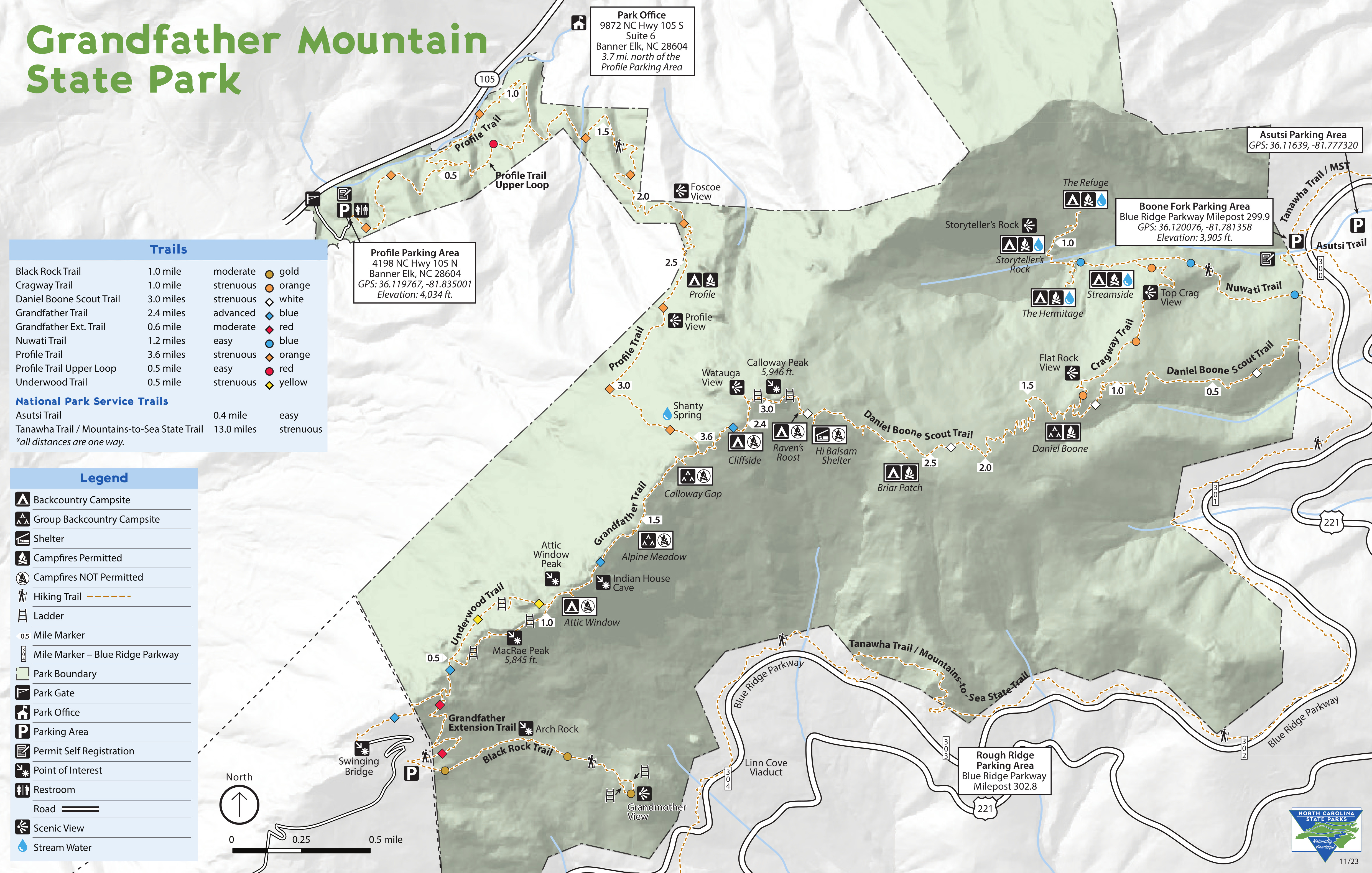 No mountain for old men by DixieFlyer This guide describes hiking to the summit of Calloway Peak, the highpoint of Grandfather Mountain, via the Profile Trail. Grandfather Mountain is in western North Carolina, about 70 miles northeast of Asheville and 15 miles southwest of Boone. Calloway Peak is at an elevation of 5,946 feet and it has a prominence of 2,445 feet. Grandfather Mountain is the highpoint of two North Carolina counties: Watauga County and Caldwell County. History Grandfather Mountain is part of the Appalachian Mountain chain, which dates back to 1.1 billion years ago. These mountains today are a product of two things: mountain building that culminated 300 million years ago and erosion that has been ongoing for 100 million years and continues to this day. It is said that these mountains were once 10X higher than they are today.