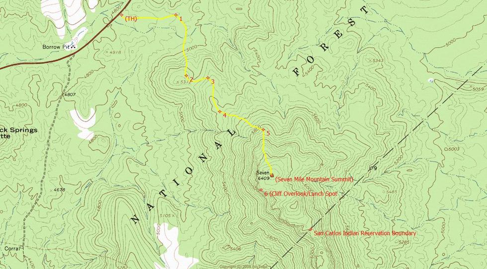 Approximately 3.5 miles southwest of the trailhead along US60 is the Jones Water campground. Jones Water is a unique developed campground with 12 small private tent sites along a mature and lush riparian area at an elevation of 4,000 feet. Jones Water is a "non-fee" primitive campground and offers only basic amenities. Use is typically light. Hike Durable pants are recommended for this hike. Bushwhacking is light to moderate. However, your legs will still take a beating along much of the route. Utilize extensive existing game trails as much as possible to ease progress. Animals always know the best way through a tricky area. Don't fight the terrain, slow down, and use it to your advantage. Don't let the "2 miles to the summit" stats fool you. In those 2 miles, you will be climbing about 1,600 vertical feet with no trail. Unless you're in killer shape, it's going to be a while before you see the top. The best way to tackle this hike is to pace yourself. Initially push straight to the summit, take a much-needed break, and finish up by exploring all of the tasty treats that Sevenmile Mountain has to offer. The designated trailhead is located at a large gravel pull-off along US60 ("TH" Lat. 33 degrees/37'/01.74"/N & Long. 110 degrees/36'/11.39"/W). You will need to cross a barbed-wire fence from the trailhead and walk a short distance southeast to a recognizable open sand wash. Follow this sand wash slightly northeast for about a quarter-mile ("Mark 1" Lat. 33 degrees/37'/01.65"/N & Long. 110 degrees/35'/48.94"/W) and then head mostly south towards the summit of a small hill ("Mark 2" Lat. 33 degrees/36'/40.67"/N & Long. 110 degrees/35'/44.73"/W). Near this location is an abandoned roadbed that happens to head where you need to go. The roadbed will head south towards a saddle and then bend to the east where it ends near a ridge ("Mark 3" Lat. 33 degrees/36'/39.95"/N & Long. 110 degrees/35'/35.89"/W). Head up the ridge to the south. Along this ridge is another old roadbed that heads up to a flat bench ("Mark 4" Lat. 33 degrees/36'/28.31"/N & Long. 110 degrees/35'/30.86"/W). From this bench, you will leave the road and start heading southeast up the Sevenmile Mountain approach. Things start to get a little brushier, but if you keep your eyes open, it seemed like there were always openings to pick your way through. Just take your time and pay attention to the terrain. You will initially be heading southeast and somewhat cross-slope to the main ridge that leads to the summit ("Mark 5" Lat. 33 degrees/36'/21.99"/N & Long. 110 degrees/35'/12.88"/W). From this point, you will now be climbing straight to the summit following a distinct ridge crest ("Summit" Lat. 33 degrees/36'/05.93"/N & Long. 110 degrees/35'/09.31"/W). The slope is steep. However, the ground is soft with good footing, and there is an obvious heavily used game trail heading up through the brush. Follow the trail as much as possible to ease progress. The remaining distance to the summit is less steep. However, the brush becomes thicker. Reaching the summit is always such a relief and gives a feeling of accomplishment. Soak in the views and take a much-needed break. The real treasures of Sevenmile Mountain are the rugged cliffs that line the western slope just below the summit. Start by hiking across to the lower secondary summit for views of the remaining ridgeline and San Carlos Indian Reservation boundary, which is just below the summit. The views looking to the southeastern segments of the mountain range are very cool. If you have extra time, it would be worth the effort to explore the narrow ridge that heads to the far edge of the mountain. Now for the icing on the cake. Head back down from the secondary summit and work your way northwest to a jaw-dropping cliff overlook that forms a distinct point coming out from the mountain ("Mark 6" Lat. 33 degrees/36'/01.07"/N & Long. 110 degrees/35'/13.75"/W). The views are killer, and the severity of the drop-off is downright scary. This is a "no brainer" lunch spot. Be very cautious of the wide splits and gaping holes between the enormous boulders. They seem innocent while stepping over them until you look down and see just how deep they are. This is a very serious location that demands respect. After lunch, head back by following a bench that works its way along the remaining cliffs. The walk is pleasant with light brush and the elevation contour that you are following wraps around back to the ridgeline used to head back down the mountain. See maps for locations of waypoints described in the text and for further clarification. Summary Sevenmile Mountain is a very manageable and rewarding off-trail summit hike that genuinely delivers from start to finish. Although somewhat frustrating in places, the challenges are never enough to distract from a great day of backcountry hiking. This is a unique location. The views are epic, and the cliffs that line the western slope are extraordinary. If you love summit hikes, Sevenmile Mountain NEEDS to be on your list. Count on having it all to yourself if you go. Check out the Triplogs. Leave No Trace and +Add a Triplog after your hike to support this local community. One-Way Notice This hike is listed as One-Way. When hiking several trails on a single "hike", log it with a generic name that describes the hike. Then link the trails traveled, check out the example. |