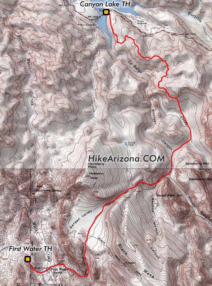 To First Water Trailhead From Mesa follow Highway 60 East to Idaho Road. Turn North onto Idaho Road which is SR88 and follow North 2.2 miles. SR88 bends right just past Scenic St. and Idaho continues North. Be sure to go right and stay on SR88. Follow SR88 5.2 miles to the signed turnoff for First Water Trailhead, this is FR-78. Turn right on to FR-78 and follow 2.6 miles to the end.