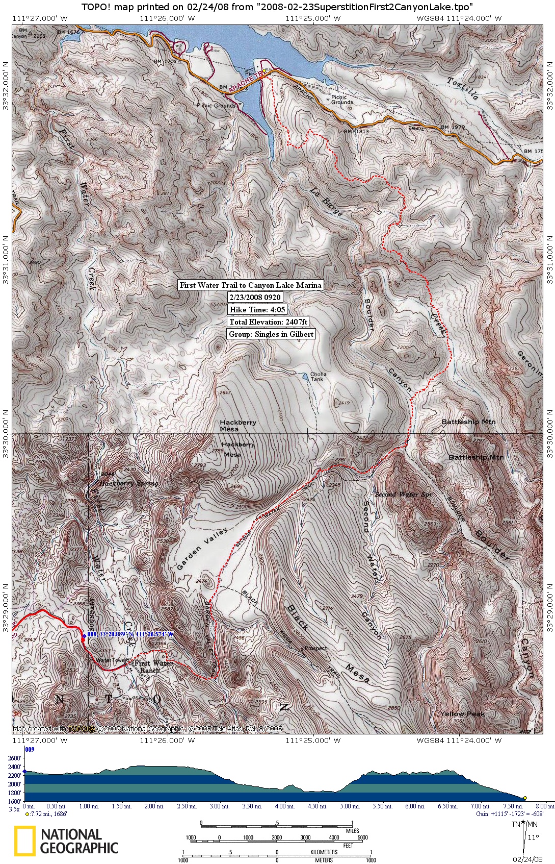 I only see parts of this hike in the index. It involves 3 different trails and I want to put them together here as a great shuttle hike. It starts at First Water Trailhead going SE on the Dutchman's trail (104). After almost 0.3 miles there is a junction with Second Water Trail(236). In another mile and a half, there is a junction with Black Mesa Trail (also a great loop). Stay on Second Water Trail as it crosses Garden Valley which, for a while, as Joe B. puts it, is an "easy stroll". However, do not get too carried away with the calm, flat, wide trail. As you proceed East the trail begins to drop down into Second Water Spring. The trail gets somewhat steep here but still fairly easy. In my March hike, there was lots of water and one could hear the water flowing.