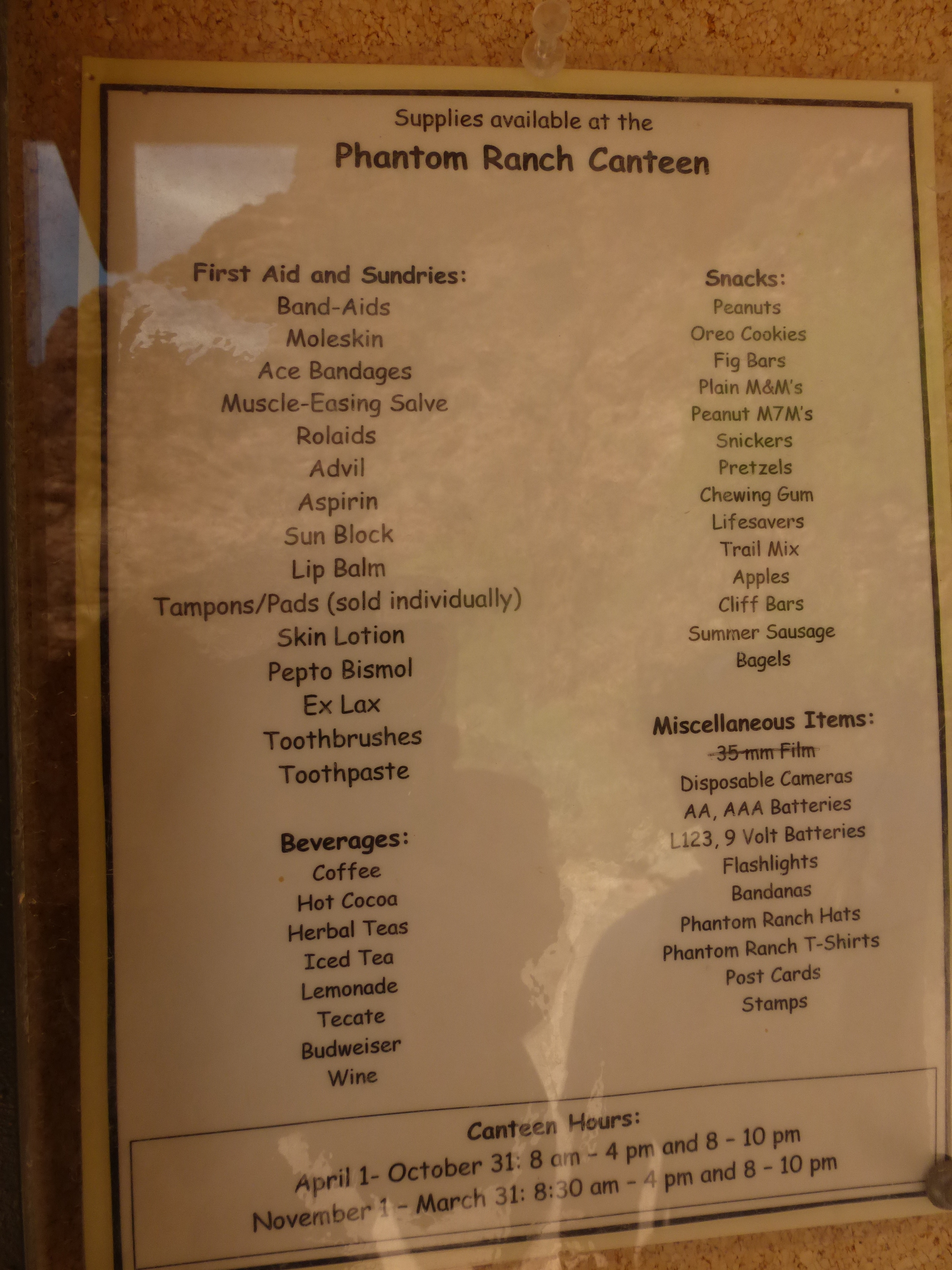 John9L wrote:Here is a list of snacks & supplies available at Phantom Ranch. I took this pic a few weeks ago when I was down there.