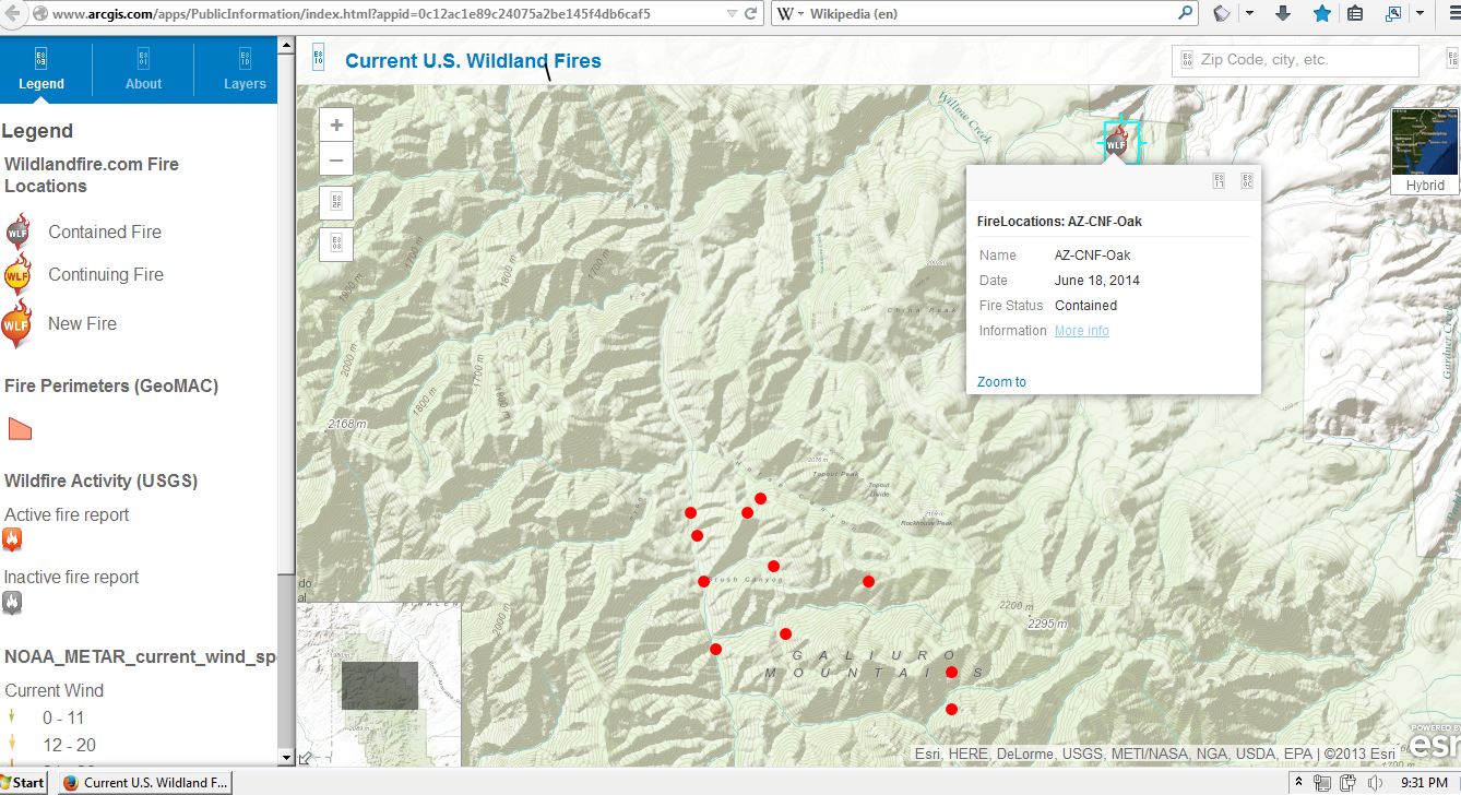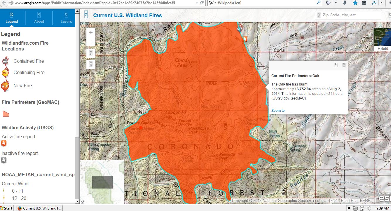 Today Map says “Current Fire Perimeters: “The Oak fire has burnt approximately 12,819.62 acres as of June 30, 2014. This information is updated ~24 hours (USGS.gov, GeoMAC).”