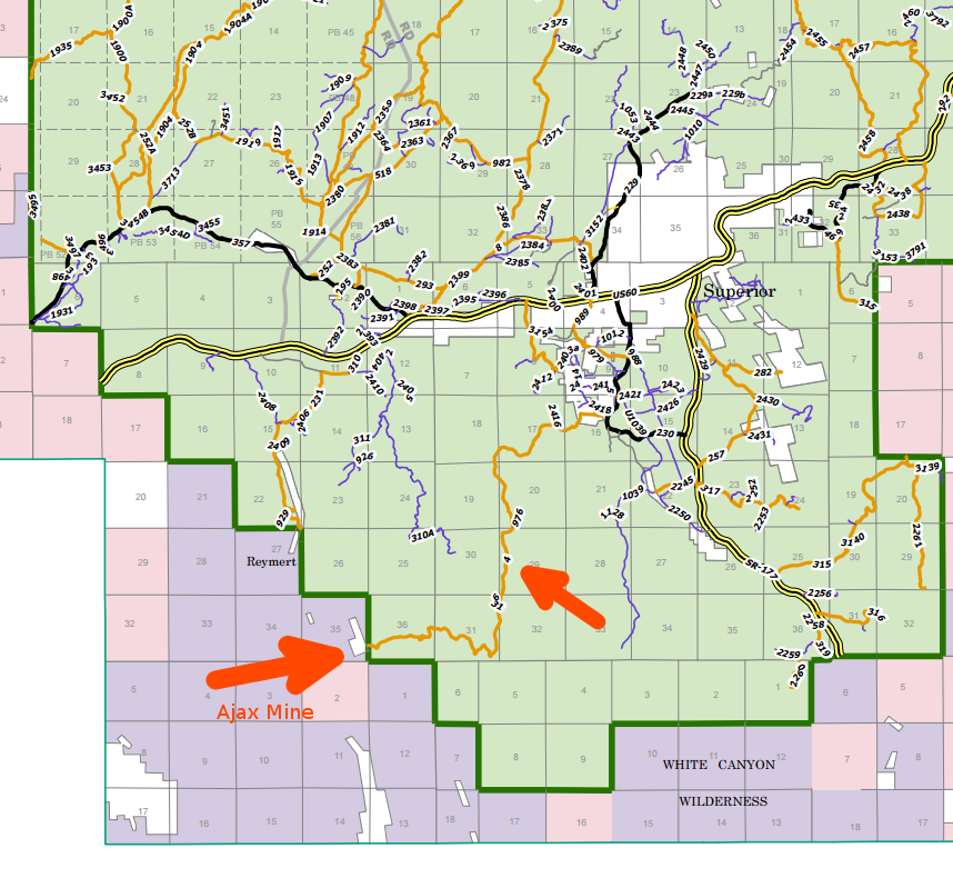 The road comes off the road pointed out as high clearance above. Where the road coming out of Telegraph Canyon makes the hard western turn towards Ajax mine, the old 296 (not listed with a number on recent Topos) shoots off to the south by southeast and makes a loop that ends near the 17/16 trailhead just west of Ajax Peak.