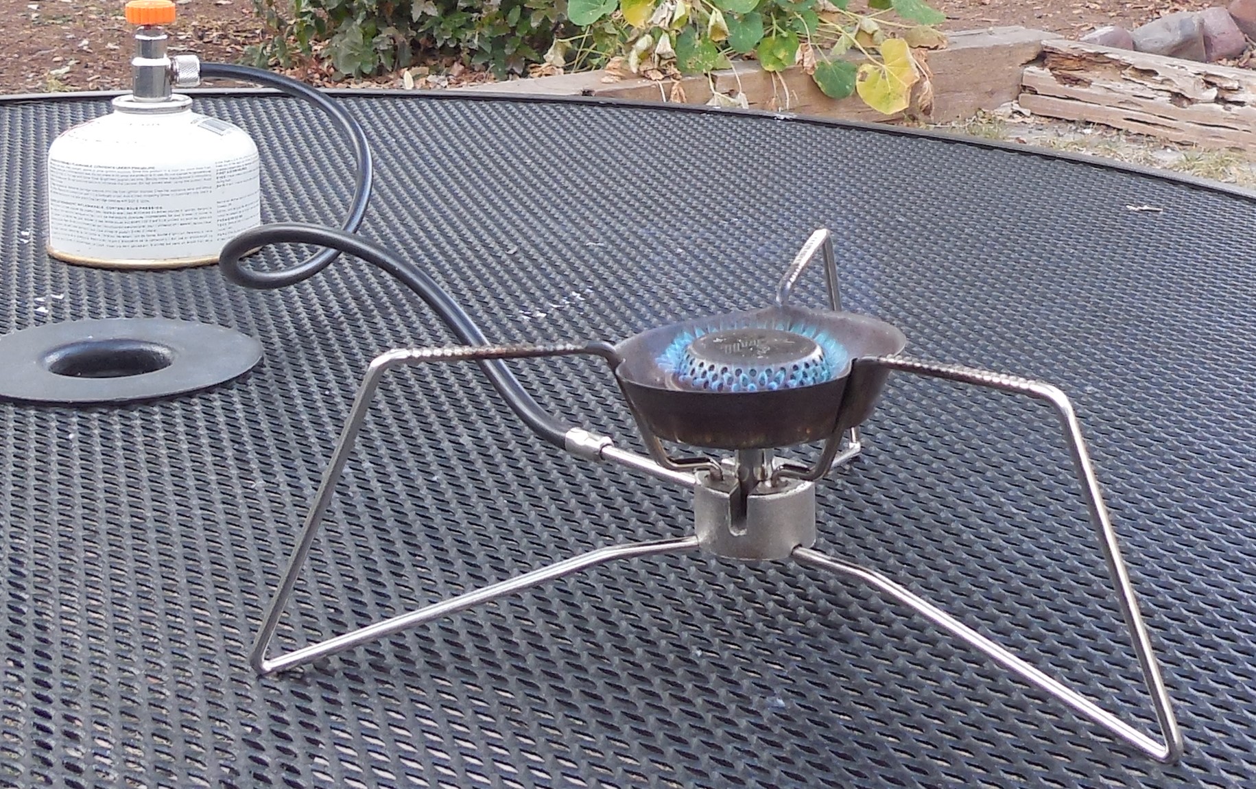 Newer version of the Grasshopper stove. The older ones used the long narrow LPG cylinders and the newer version uses the common 1 lb. cylinder.