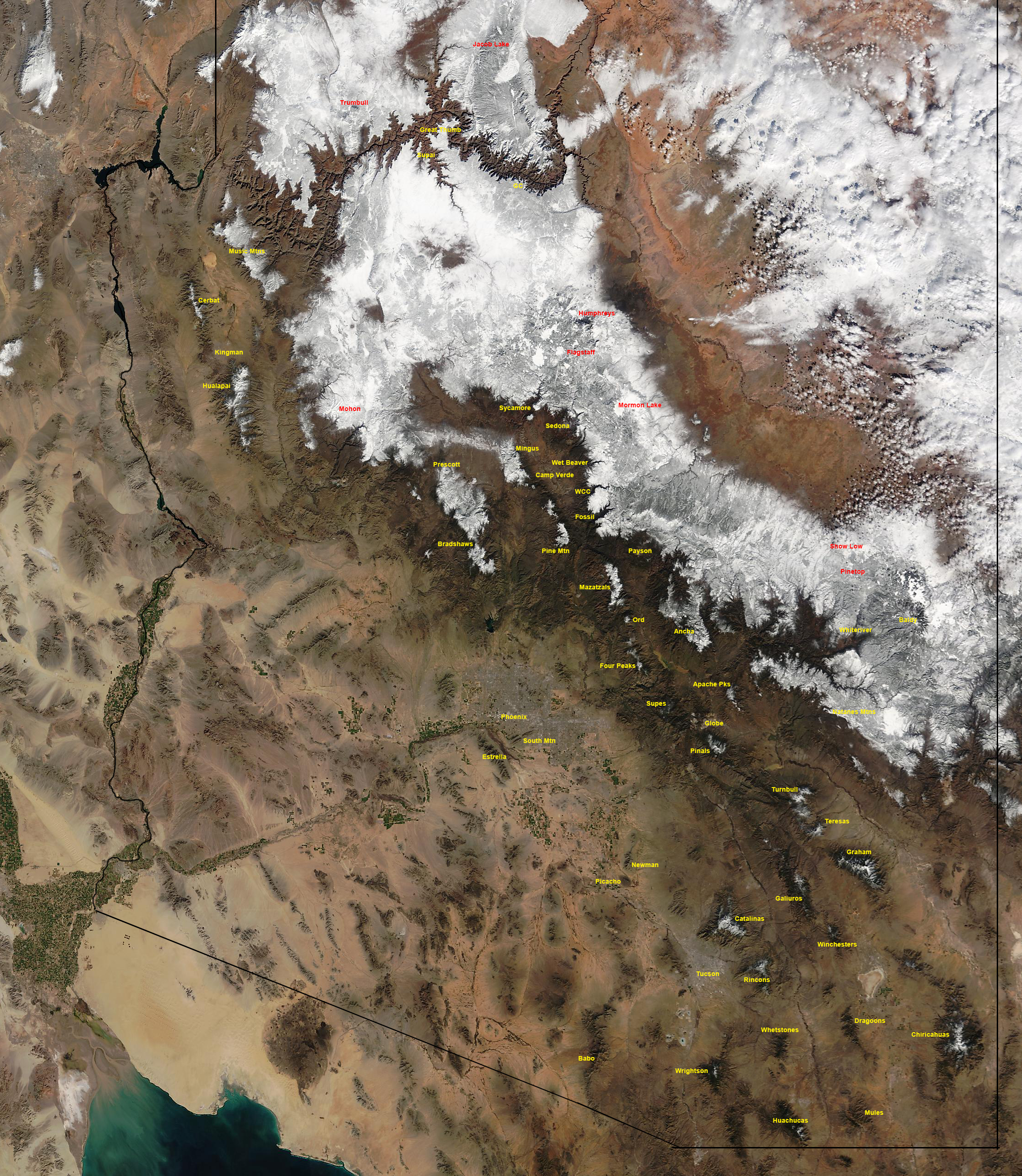 The clear weather made yesterday's MODIS satellite photo a stunning view of our state. I've taken the time to label a few landmarks. The snow-capped sky islands are especially neat to see. The northeast corner of the state is obscured by clouds.