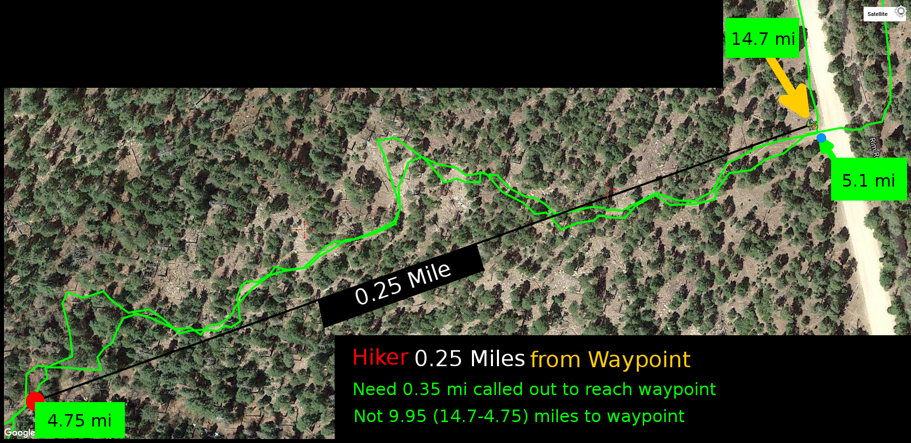- waypoint is closest to a point in the track at 14.7 miles