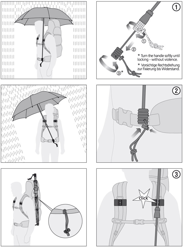 "I was most dubious about the telescope hands-free trekking umbrella. I imagined the silliness of umbrella hats multiplied. Of course, because I am often wrong, I found myself most surprised by this completely awesome umbrella. To use the telescoping hands-free all you need to do is attach two Velcro loops with the umbrella clip to either shoulder strap of your backpack, swivel to open and then swivel to close the two telescoping parts to get it at the right height and slip the wrist loop through your hip belt to secure. In less than two minutes you are ready to go hands free.