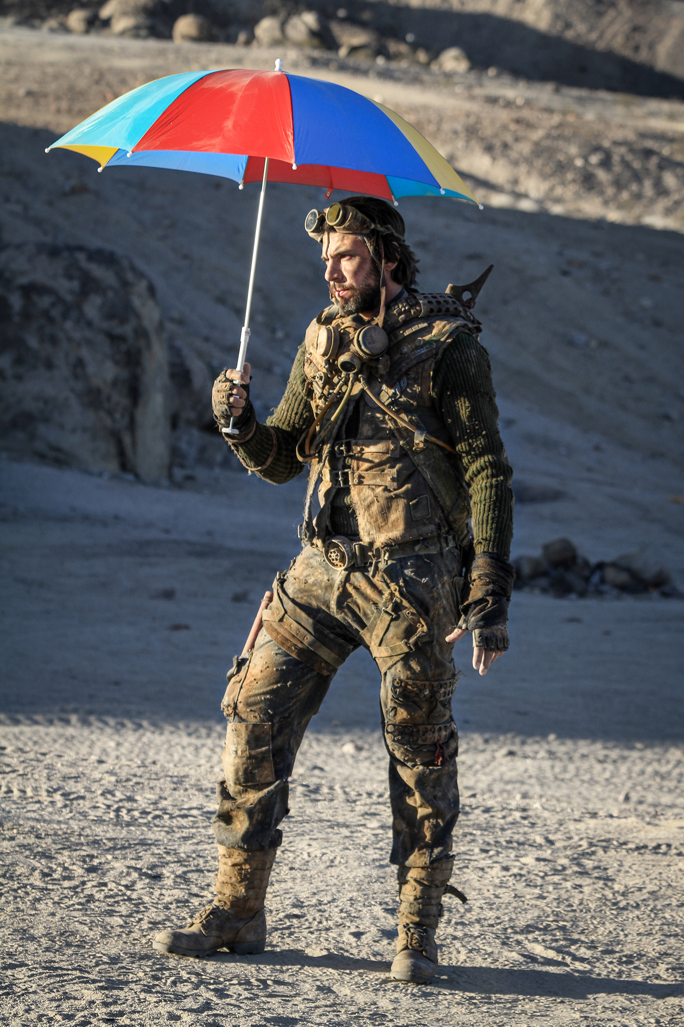 That colorful umbrella is quite a contrast to the whole road warrior vibe.
