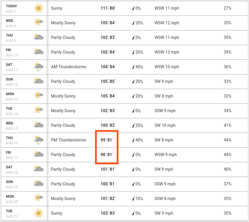 I'm not sure how I feel about that. I actually liked that this summer has been reasonably cool so far. No 118 or 119 this year. 116 or 117 tomorrow sounds hot compared to the low 100s and even high 90s Phoenix was having for a while. After my week in Utah, hiking Piestewa today before noon was torture.