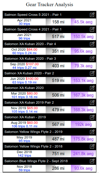 joebartels wrote:I'm about twelve years all-in on various Salomon. Currently, the Speed Cross 5. 500 miles is typical. I tried a pair of cheap insoles a few years ago and got 751 miles. While the insole extended the last hundred or so miles they were far from comfy. Perhaps because the insole was cheap, but it was like having a pillow base which in turn made the fit uncomfortably tight.