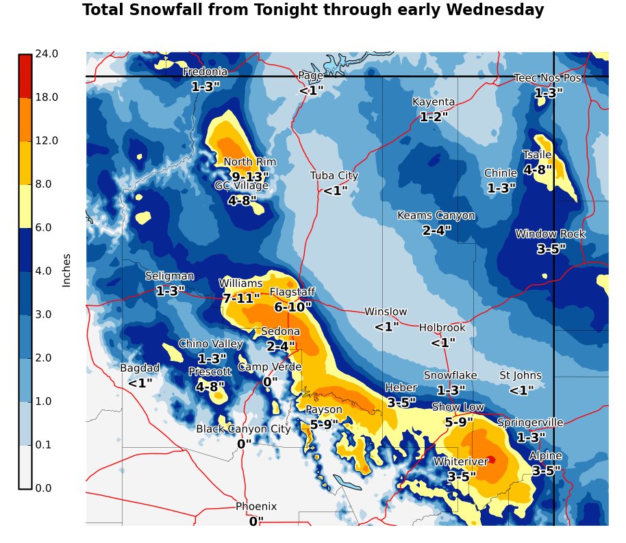 Over the span of 7 hours this afternoon, the higher-elevation NWS snowfall estimates have dropped a good percentage from the original forecast. Is it a trend that will continue? Or will the rim areas above 7000 feet really see over a foot of snow in the next 36 hours?