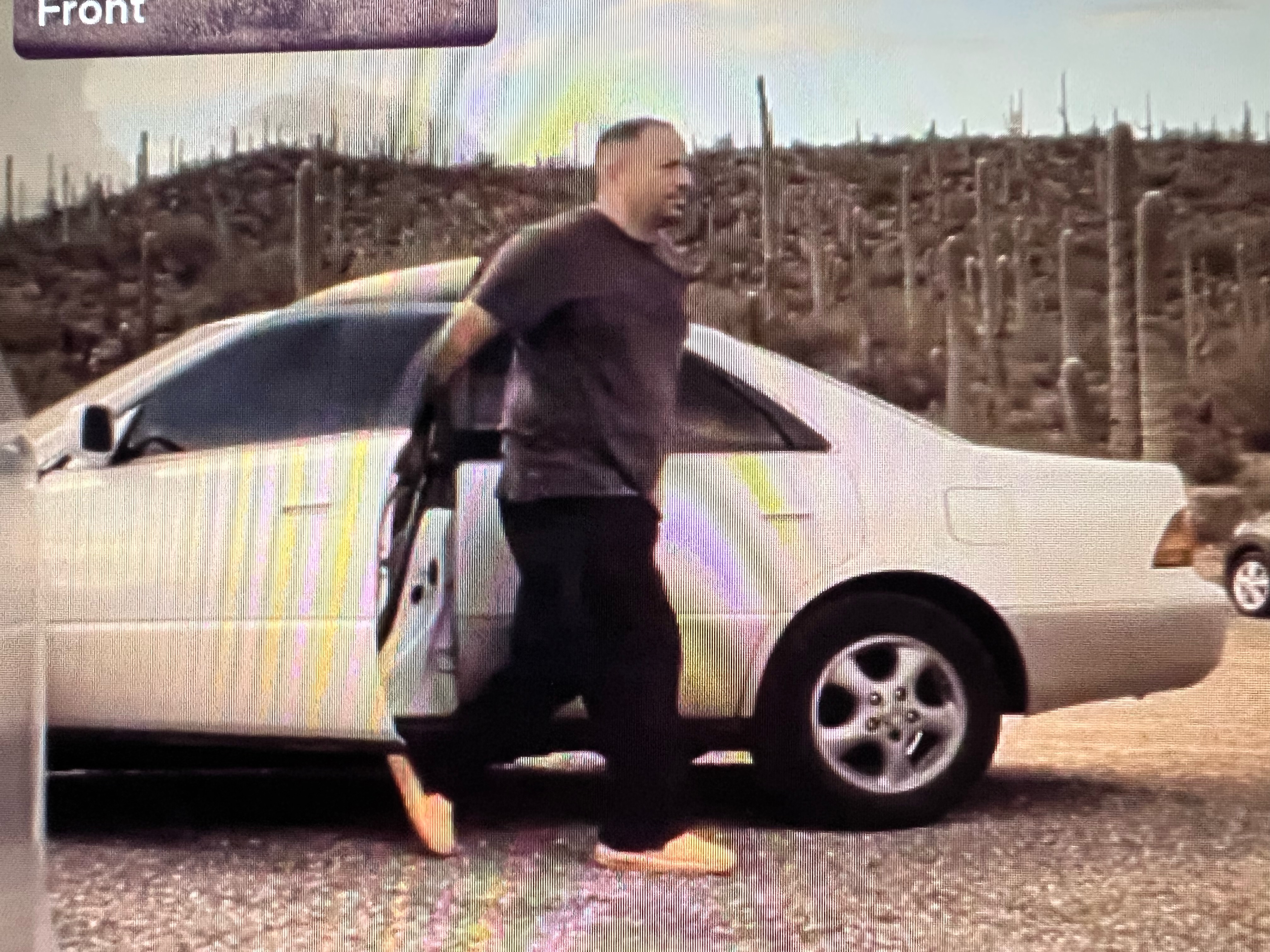 A man on a Harley style motor cycle was at the TH when I was, and I am very suspicious of him. He left right before me, hiking trail and and turned left at the first junction. He was alone, dressed in dark pants, dark shirt which I remember as long sleeved, and had a light beard, and sunglasses. He also had a military Camo-print back pack. For temps as hot as they were, he was not dressed the way I would expect. Marana PD may be able to pull Fry's and Sally security video, but the criminal had a mask on at Sallys. I am sure he did at Fry's.