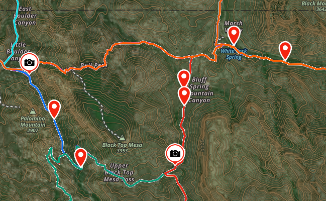 Yep, this is a really nice one. There's also one maybe .15 miles East of this below the trail that you have to look out for that's pretty epic. In general there are many fantastic camp sites between the Dutch/Cavalry intersection and Charleboi. There are several along Dutchman once you start going South of the Cavalry junction but, generally, aren't as inspiring/nice. Tend to be smaller, as well, which is a consideration if you're going with more people. Here's a snippet of some of the better camp sites in the area. This isn't all the established ones, but some of the better ones that are visible right off trail.nonot wrote:My favorite is actually near the cavalry trail intersection a little bit before you get to Black Top Mesa area.