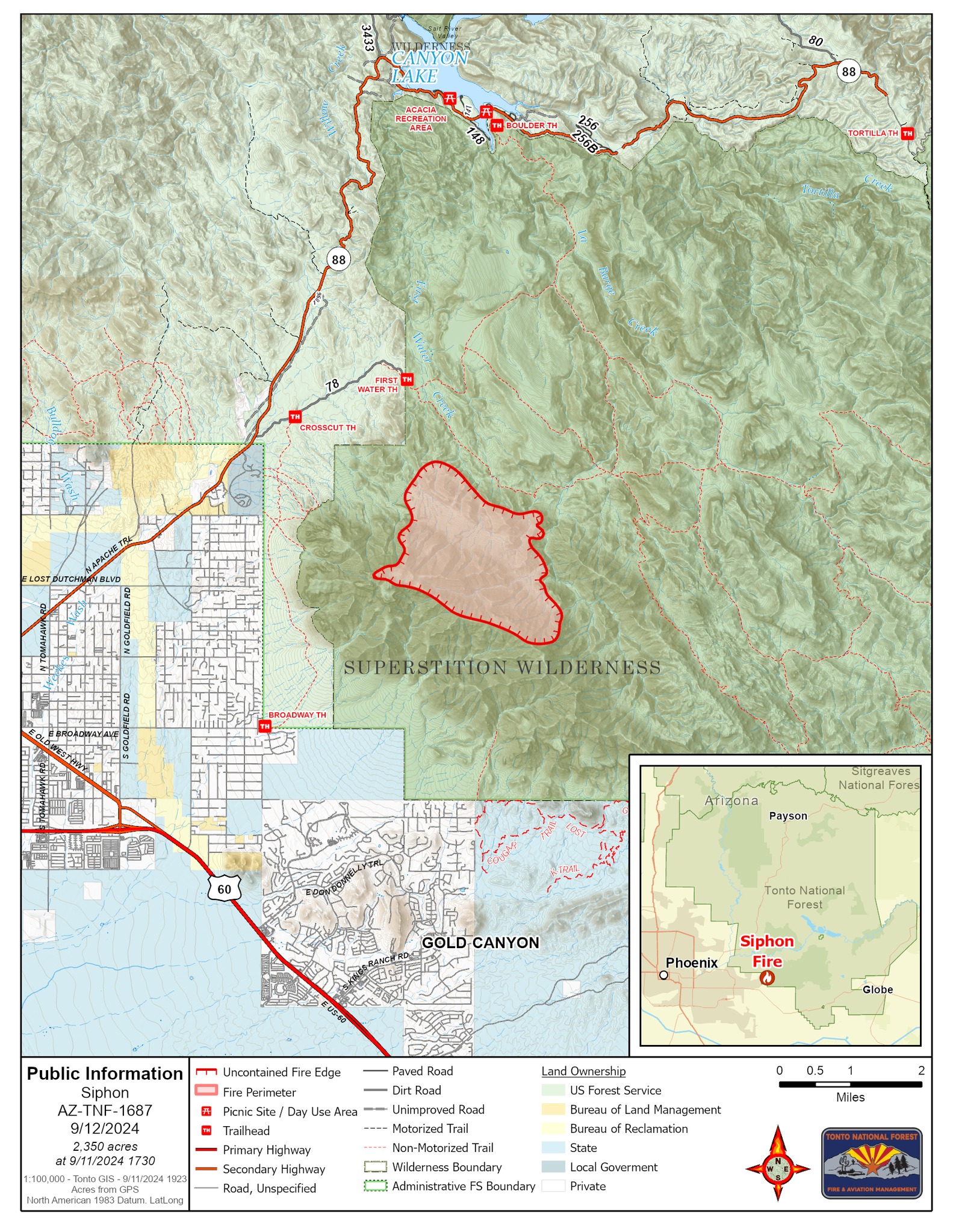 Since it's burning in the wilderness and there are no ground crews being used, I think it's safe to say that there is virtually zero effort to slow, suppress, or extinguish this one for now. Good luck to the lone helicopter flying over and taking photos to determine how large it is.Tonto National Forest wrote:FIRE UPDATE: The #SiphonFire is 2350 acres and is currently 0% contained. The cause remains under investigation. Due to the rugged terrain, ground resources cannot safely access the fire. The public is advised to avoid the First Water, Boulder, Siphon Trails and Forest Road 78 while the Siphon Fire is active. Smoke and flames will be visible, but there are no communities at risk. Resources assigned are one Type 2 Initial Attack Crew, one suppression module and 2 engines, along with a Type 1 Helicopter. Resources on order is one water tender, two engines, and a medical team.