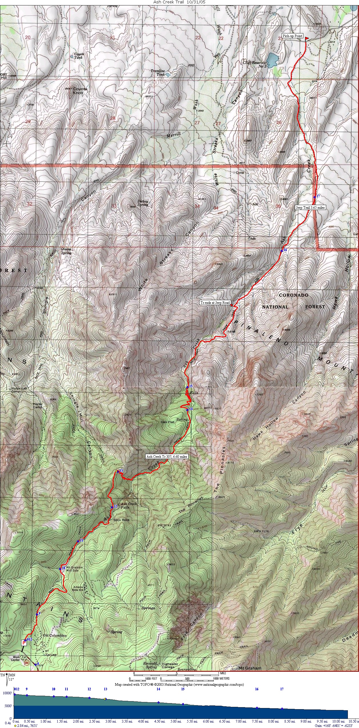 . There is much more elevation change than any trail in the Superstitions (6000 feet -like hiking from the North Rim to the Colorado River in the Grand Canyon). I would describe Ash Creek as a "southern Arizona meets the White Mountains" experience. You start in the mesquites and barrel cacti, and end up in a spruce/aspen forest. I've included a photo in this post, taken from the jeep trail section/bottom end of the Ash Creek Trail, looking up Ash Creek canyon. It was early July, ungodly hot, and the mesquites (predominant vegetation in that area) were fully leafed out.