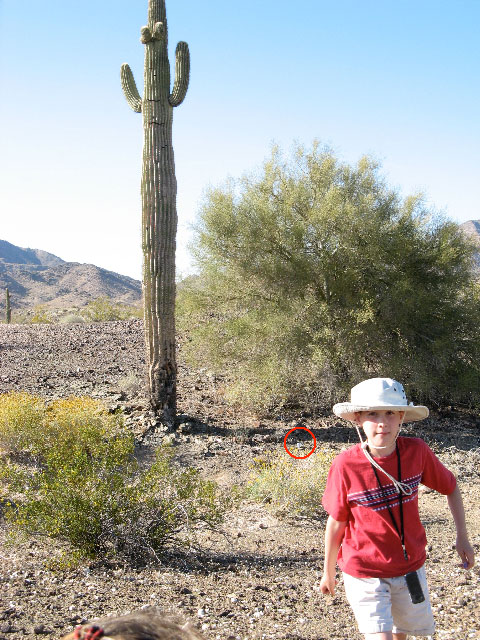 Attached is the photo of the area where the camera was left, with the camera circled.Here is the situation. I'll be as detailed as I can. My son's camera is just off exit 11 (I actually didn't remember the number but I zoomed in on another picture I had taken and could see the sign on the other side of the highway. It pays to be a shutterbug), south of east I-10. That is west of Quartzsite, East of Blythe, CA about 2 hrs from Phoenix, 1 1/2 an hr north of Yuma. The only thing on the exit is an RV campground. We exited the highway and turned right into the campground. It is gravel. We drove straight back several yards toward a "classic" looking Saguaro ahead on the right. We got out and took pictures. He put his camera down so it wouldn't be in the picture and left it. We took the pictures facing Northeast- back toward the highway. I attached the picture of where the camera is. If you zoom in, you can see it on to the right of the cactus and the left of the bush (which is about half the height of the cactus so it is big). I can send 2- 3 more pictures if it might help your friend figure out where to look. I don't think it will be difficult to find once someone is willing to go look. Please tell him I would be happy to reimburse shipping and even a couple bucks for gas if he can return it. If you need to give him my email or phone feel free.