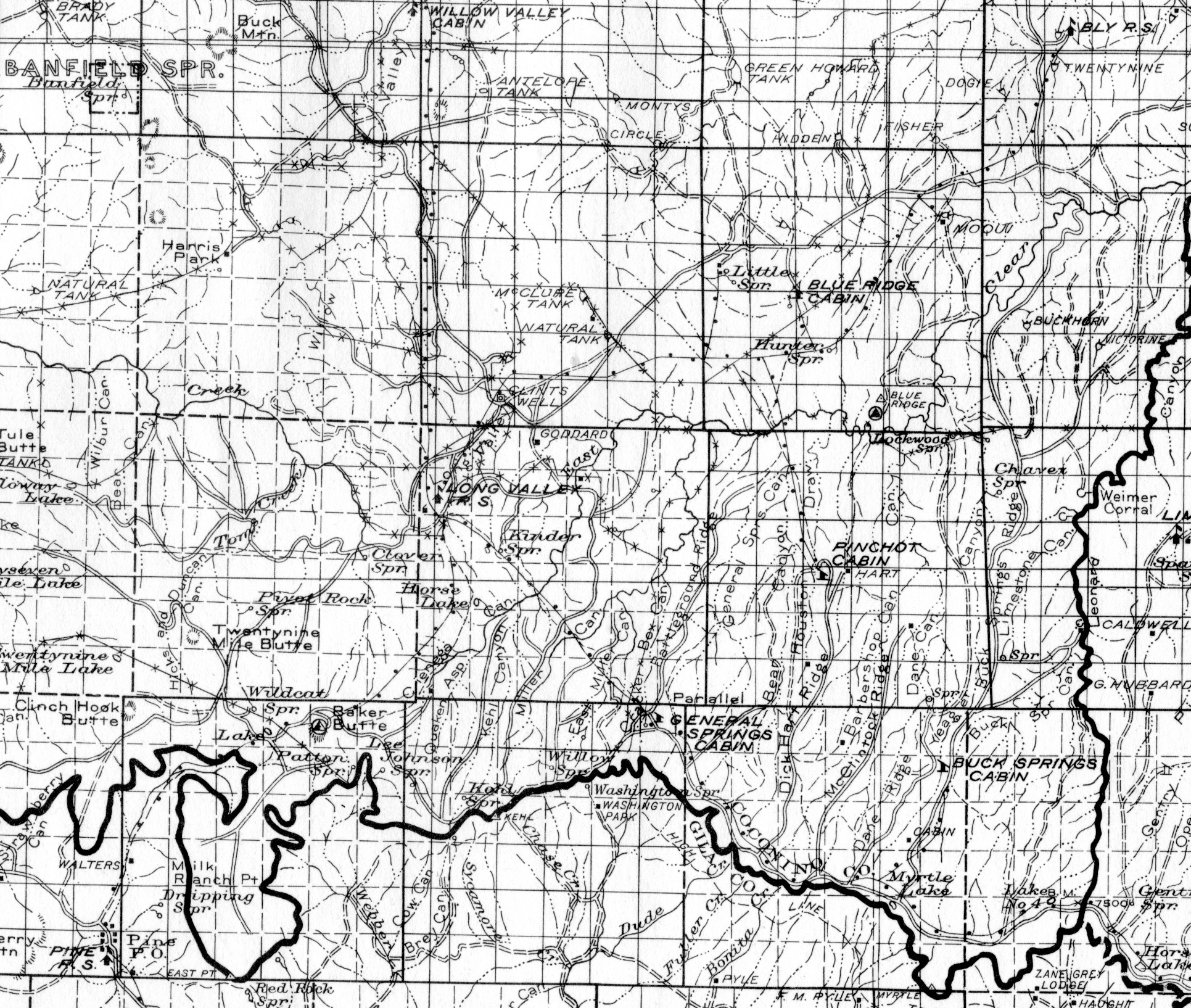 Some more research... the east end of the ranch property is in Mahan Park, which is about 6 miles north of Clints Well, just west of Lake Mary Road (FH3). This is basically the upper reaches of Willow Valley. While this isn't the actual ranch, there are some ranch-owned buildings here, though I don't know how old they are. So, for a trail to get to this area from East Clear Creek, it would have to cross Hwy 87 and/or Lake Mary Road. Of course, either/both of those might have been a dirt road when this trail existed, so that might not be a big problem. Anybody know of any trails in the Clints Well area that might fit this description?