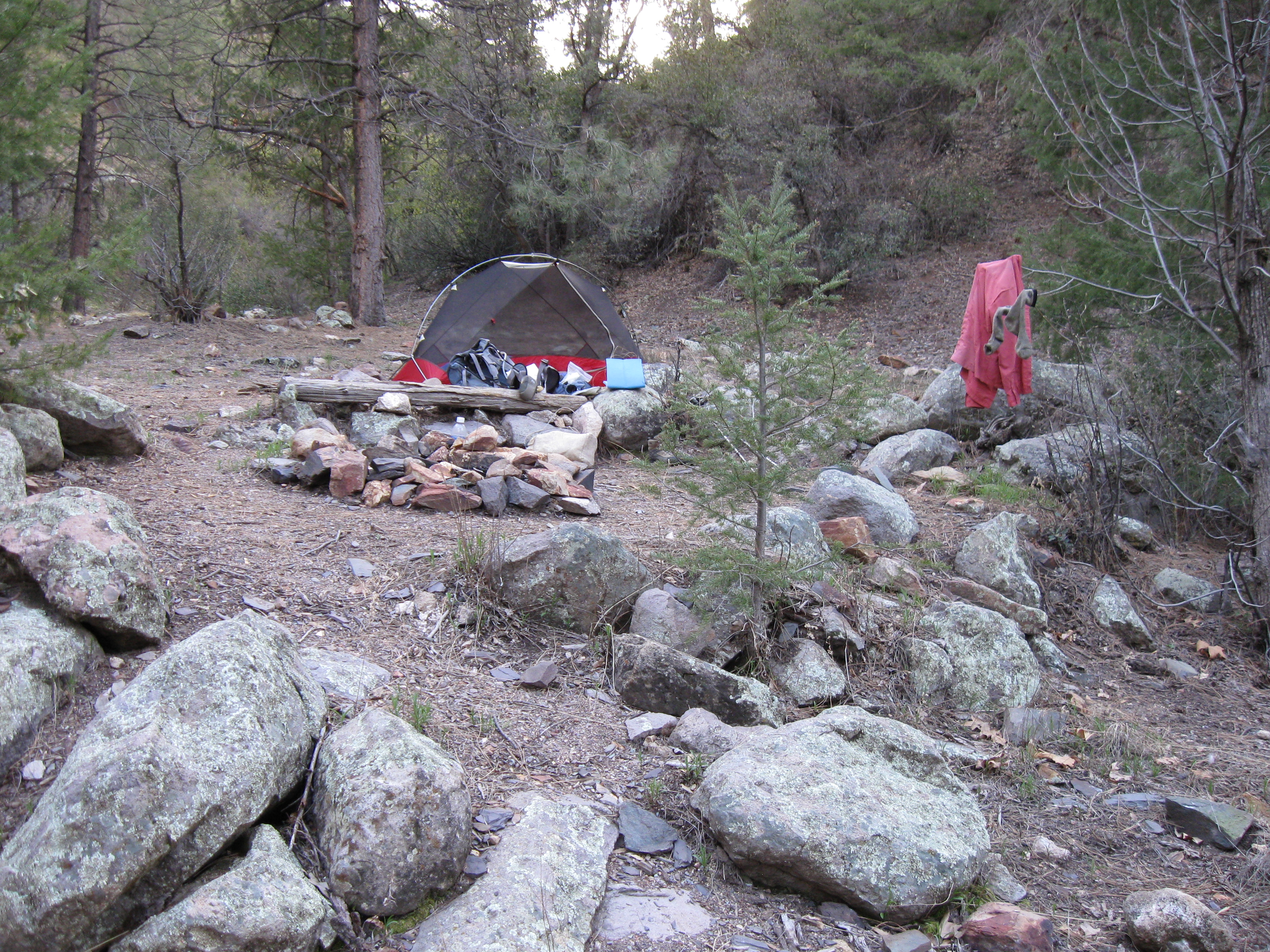 From the pictures you can tell the campsite is narrow and rocky, but it was the flattest widest area we found that was not choked with brush (besides the trail).