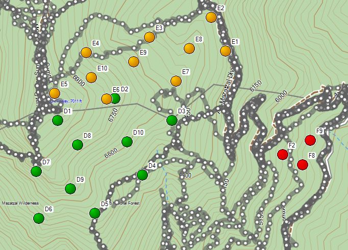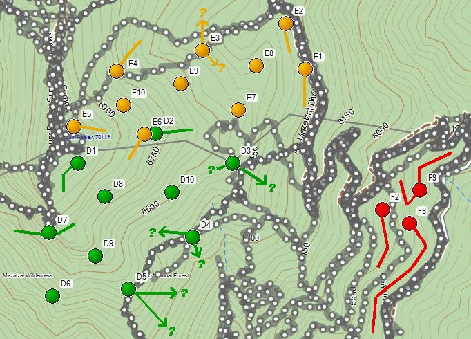 Thanks for taking the time to do the detail analysis. I will be editing our previously published WPs search areas plan( http://hikearizona.com/location_g.php?MY=156 ) to incorporate your recommended changes then we will republish it ASAP for all individual searches to use ongoing and until we can organize and schedule a revised date for another group search effort. When completed I will publish it on our main GPSjoe forum search topic :thanx: all!CannondaleKid wrote: D, E & F zoomed in with possible changes to avoid previously searched areas