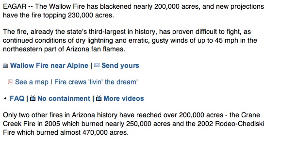 Here's a news story on the Wallow Fire, but as of this writing it has not made it to inciweb yet. (Maybe tomorrow?)