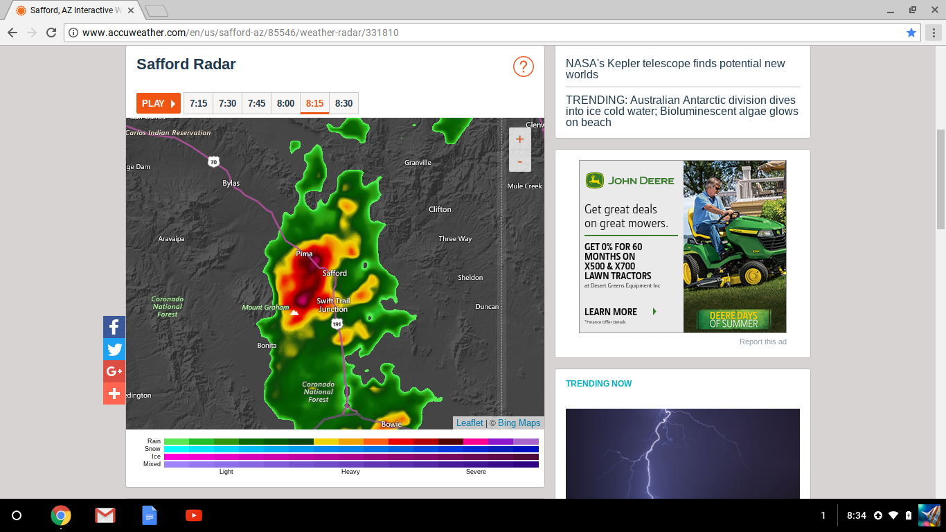 Brand new fire going on Mt. Graham ... I assume it was started by lightning from the storm that passed through. It's not on Inciweb yet. I can see it from my house, but I am not great with the landmarks up there ... guessing it's in Marijilda Canyon or somewhere nearby.