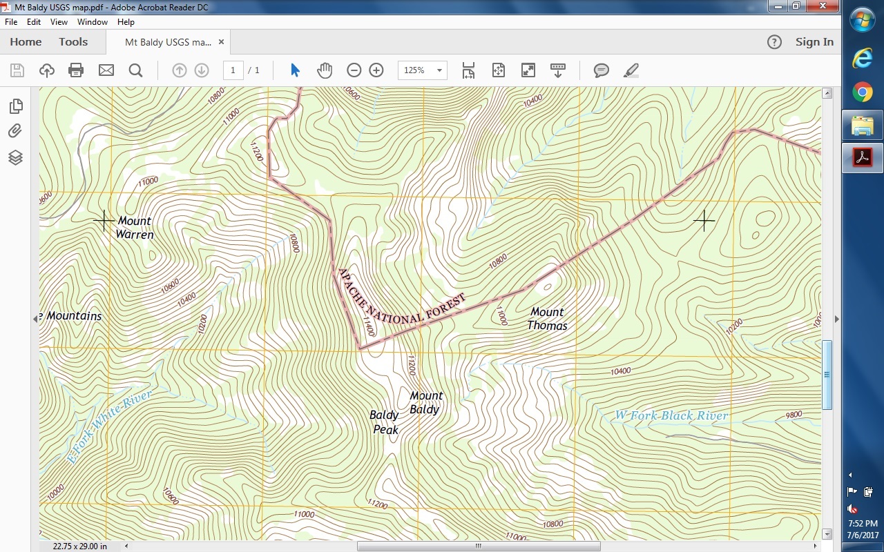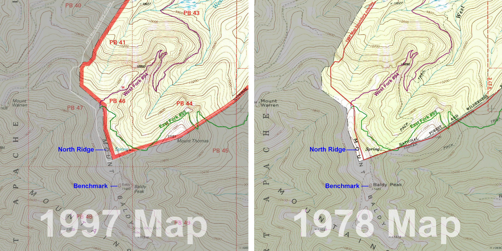 The ridge to the north of the peak was indicated to be on FS land prior to the 1997 revision of the USGS Mount Baldy quadrangle. From 1997 forward, the USGS Mount Baldy quad shows that even this point is on WMAT land. I have attached an image showing the two versions of the map, each with the boundary of the other also shown.