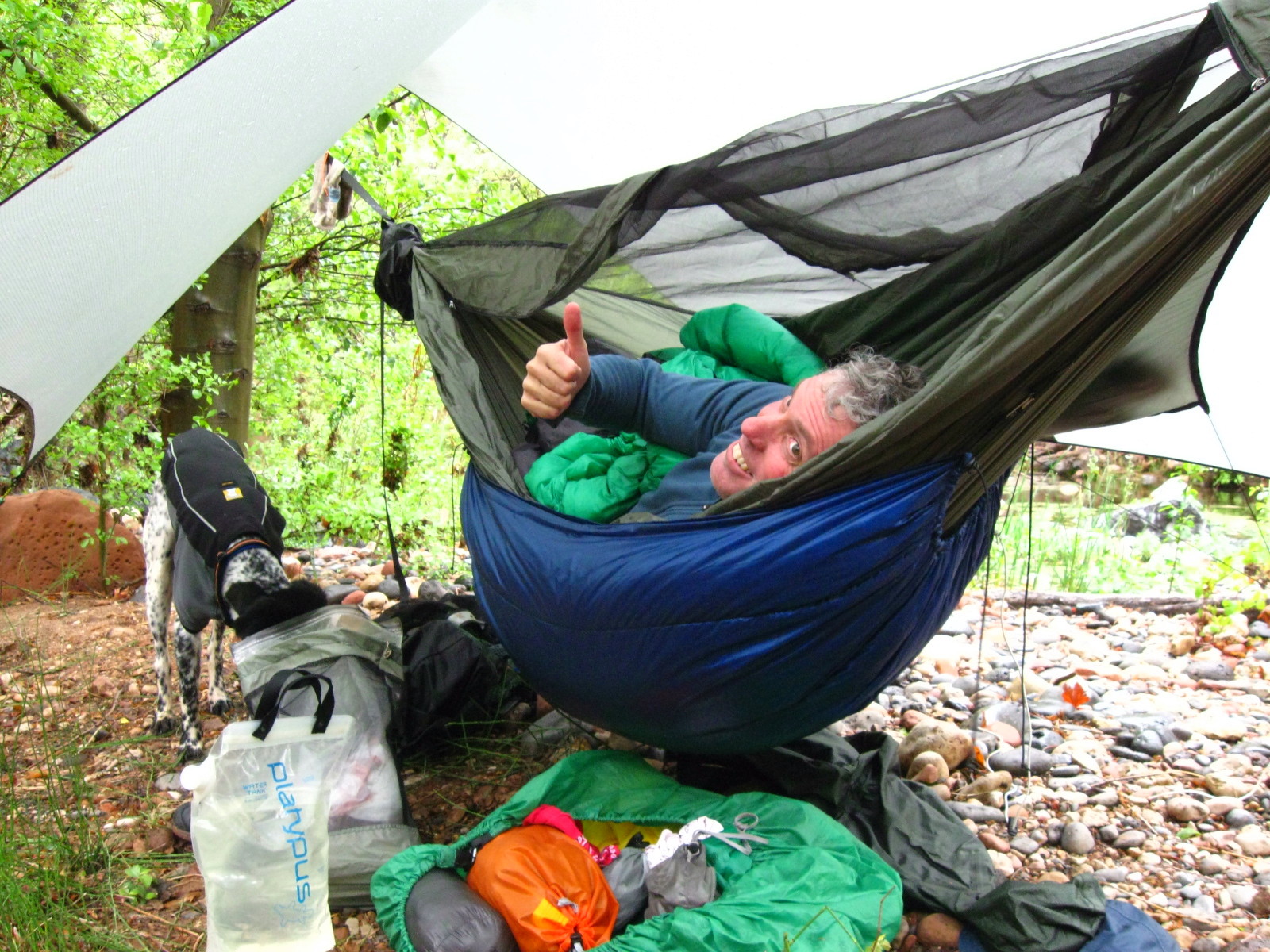 this pic shows Drewboy giving the thumb up for his new te-wa made underquilt. his weighs ~13oz and is good to 35°