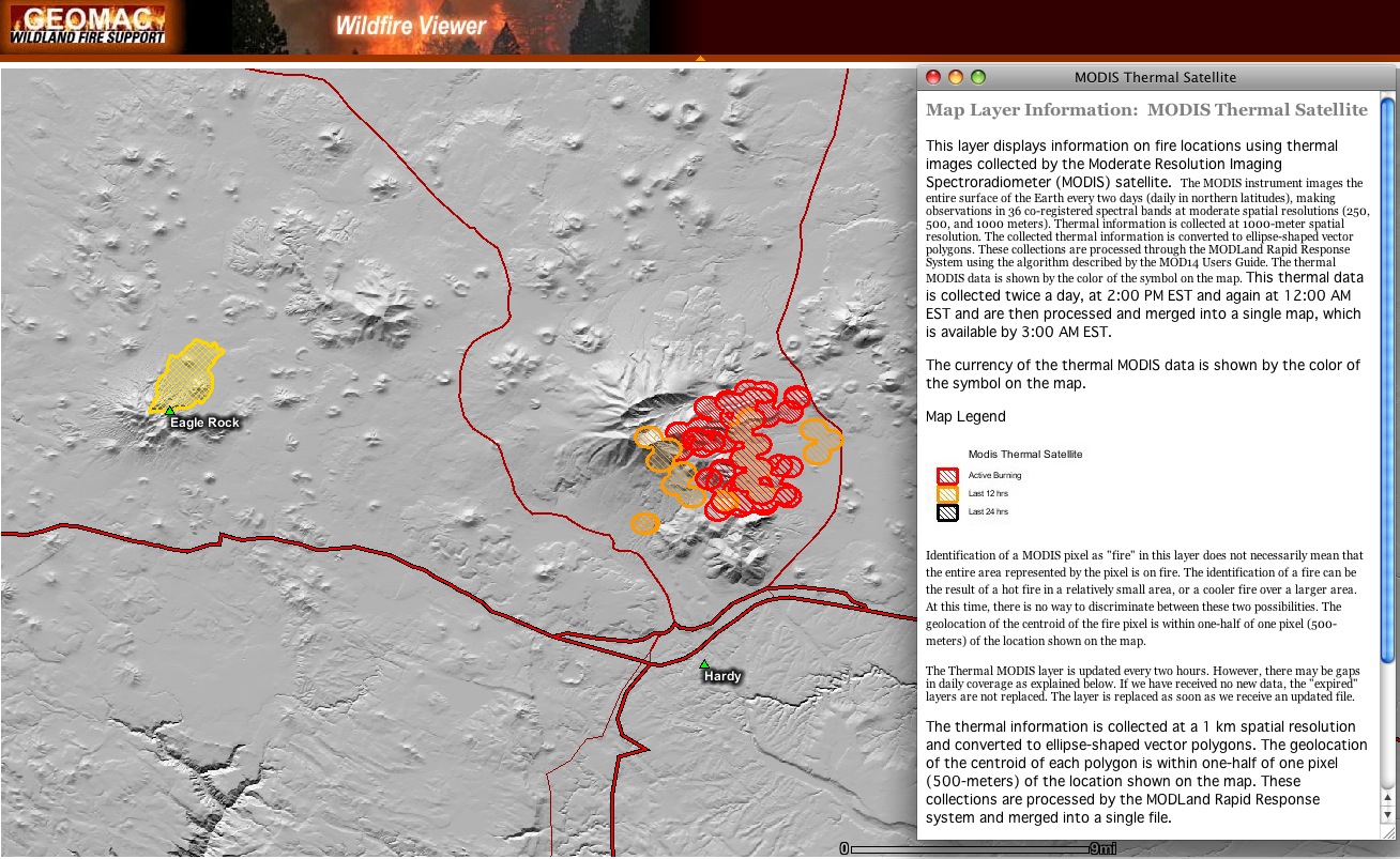 The thermal imaging from this morning doesn't look good. Please read the explanation on the screenshot so you understand that what you see doesn't necessarily mean all the red and yellow areas are burning or have burned. A "perimeter" map has not been set up yet. (That can be seen on the Eagle Rock Fire, also included here).