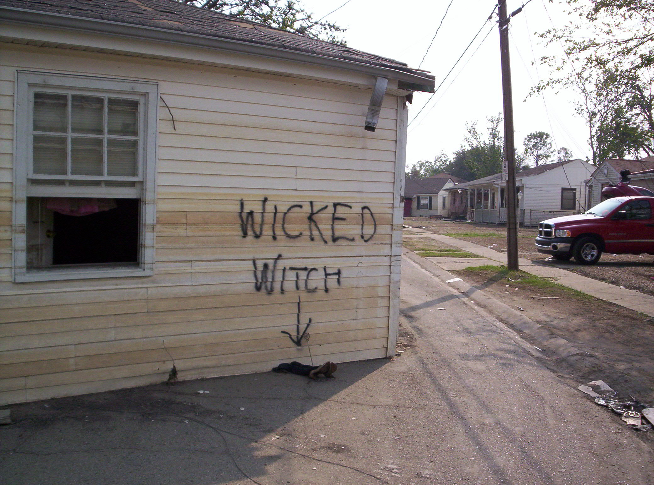 Speaking of humor in tragic situations, here's an example for you. I went and helped the ASPCA with the Animal Emergency during the aftermath of Hurricane Katrina. We went in October, a full two months after the devastation hit and worked in Saint Bernard Parrish, one of the hardest hit counties. By this time, they were starting to let residents back in during the day to do whatever they could do with their homes and belongings. But the residents had to be out of the Quarantine area by nightfall. Well, it was apparent that some of the residents had the same thought about their situation as depicted in the picture below. "You either laugh or you cry". I guess some of them decided to laugh. I know we did, it was too heavy there, you had to do something....
