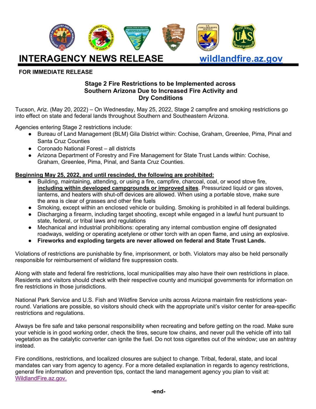 Stage 2 fire bans going into effect for Coronado NF, BLM, State Lands in Southern AZ ...