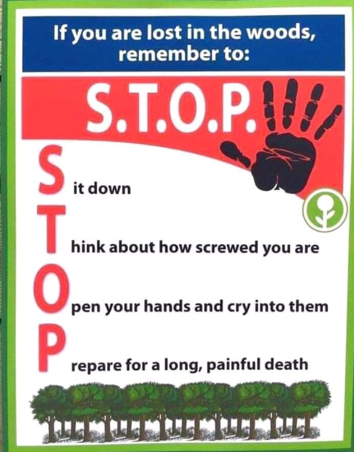 Have you ever taken those classes where you are supposed to remember those acronyms? I do remember them...long enough to take the quiz at the end of the course. I just looked up STOP, in fact. Boys' Life Magazine (apparently still in existence, who knew?) has it as (now I have forgotten it again and have to click on that tab...) Stay calm, Think, Observe, Plan. The one I run into the most is from WFR class, in regard to a patient with decreased level of consciousness: STOPEATS: Sugar, Temperature, Oxygen, Pressure, Electricity, Altitude, Toxins, Salts. (Yes, I admit, I had to look that up, too.) Anyway, your post did make me laugh.
