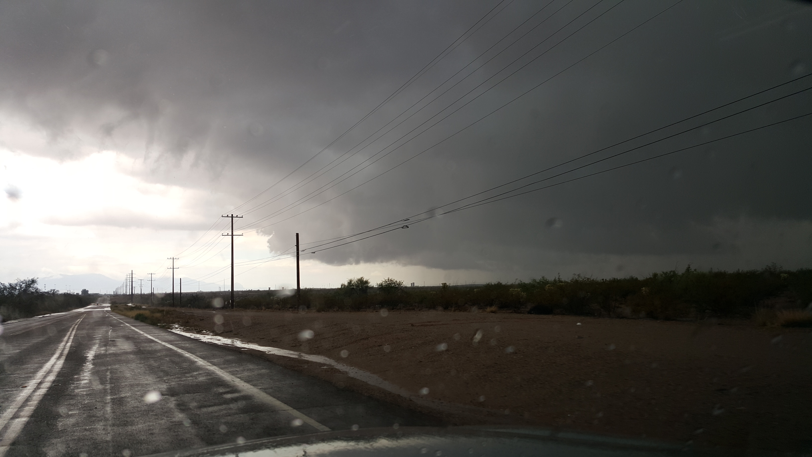 Tucson today, driving back to work from my lunch break...and my workplace is directly underneath the darker part of the clouds.