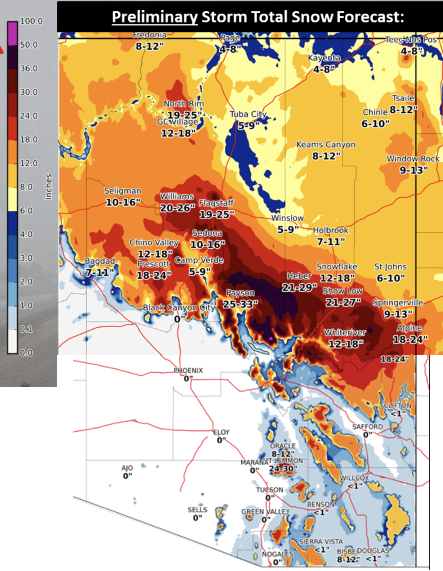 * WHAT...Heavy snow expected. Travel will be very difficult to impossible. Total snow accumulations of 12 to 24 inches, with locally higher amounts along the eastern Mogollon Rim, are expected.