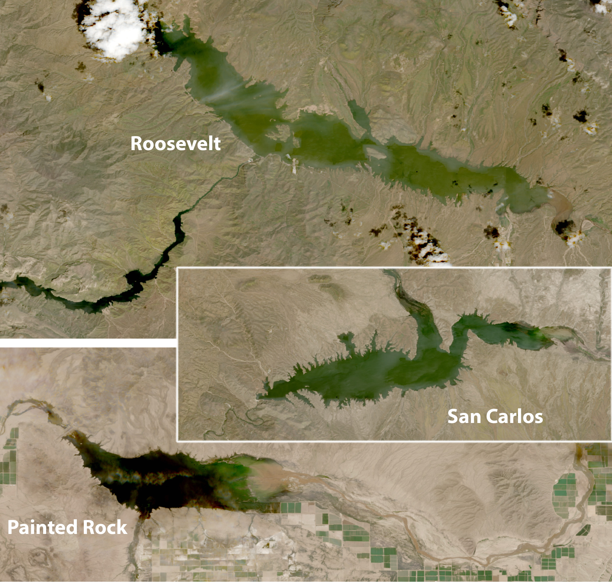 Fun photos from the latest pass of the Chinese Spy Balloon. All three photos are at the same scale, showing the relative size of each currently. When full, San Carlos has the longest coastline of any lake in Arizona. When full, Painted Rock Reservoir holds over 3.3x as much water as Roosevelt Lake can hold.