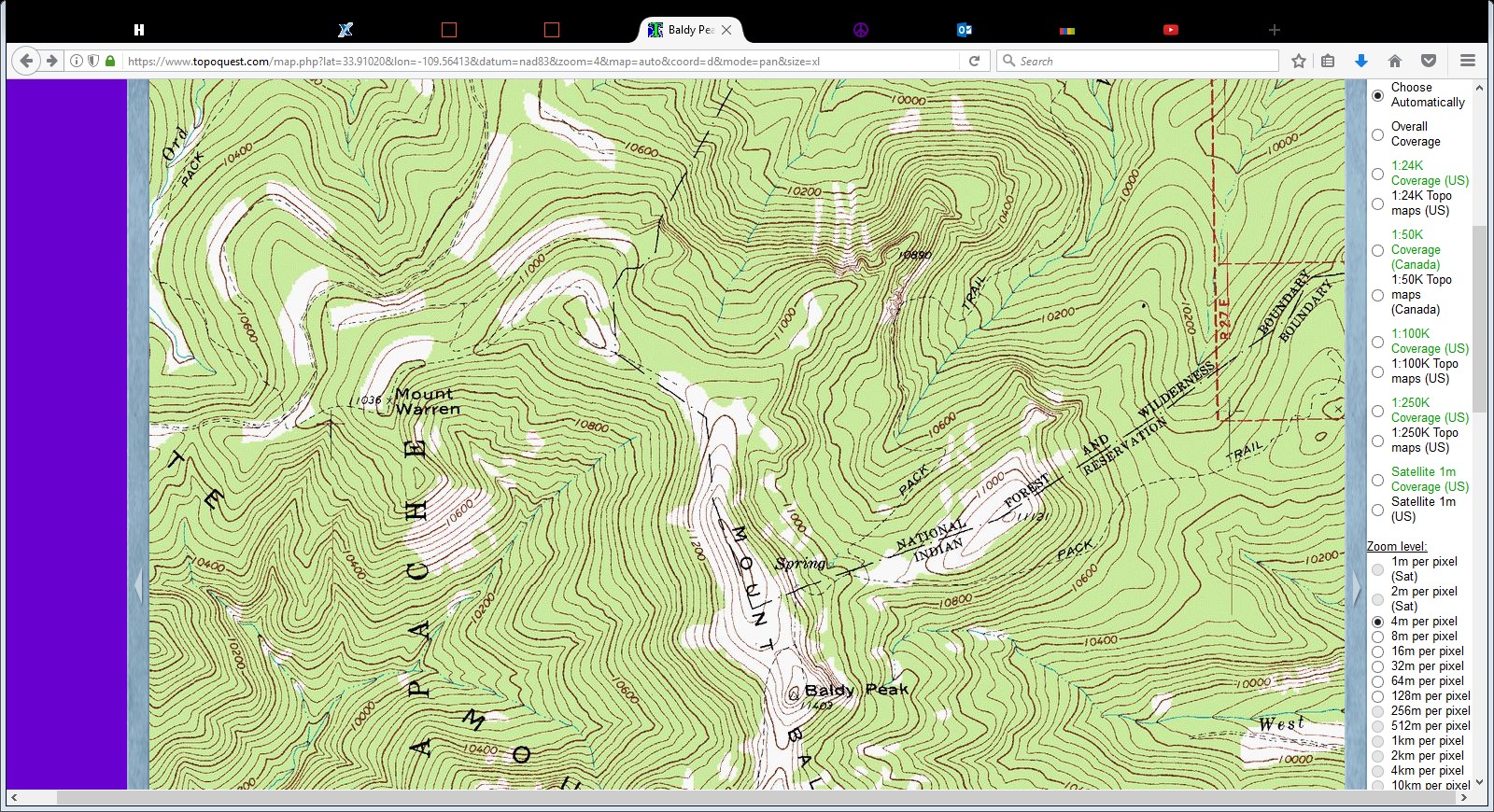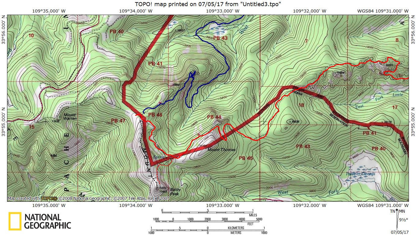 I mention all this because I think it's an important distinction to make. This places the north ridge—the probable highpoint—within the Indian Reservation, which would then make it also publicly inaccessible. The older Mount Baldy WIlderness maps (dated about 1970) show the boundary to be exactly on the north ridge. This is common practice, to place boundary waypoints on ridgelines. Shifting the boundary to a slope seems odd. Frankly, I would suggest that you carry this older version of the map, and in the rare case someone stops you, argue your point using the map in hand. "