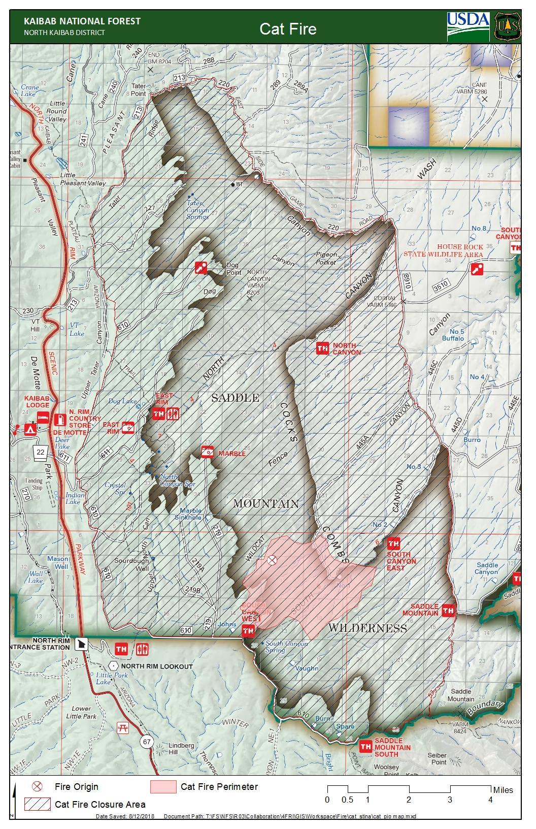 For updated fire information, visit Inciweb and search for "Cat Fire, Arizona" or stay in touch with the Kaibab National Forest on Facebook and Twitter @KaibabNF or call (928) 635-8311 for recorded fire information.