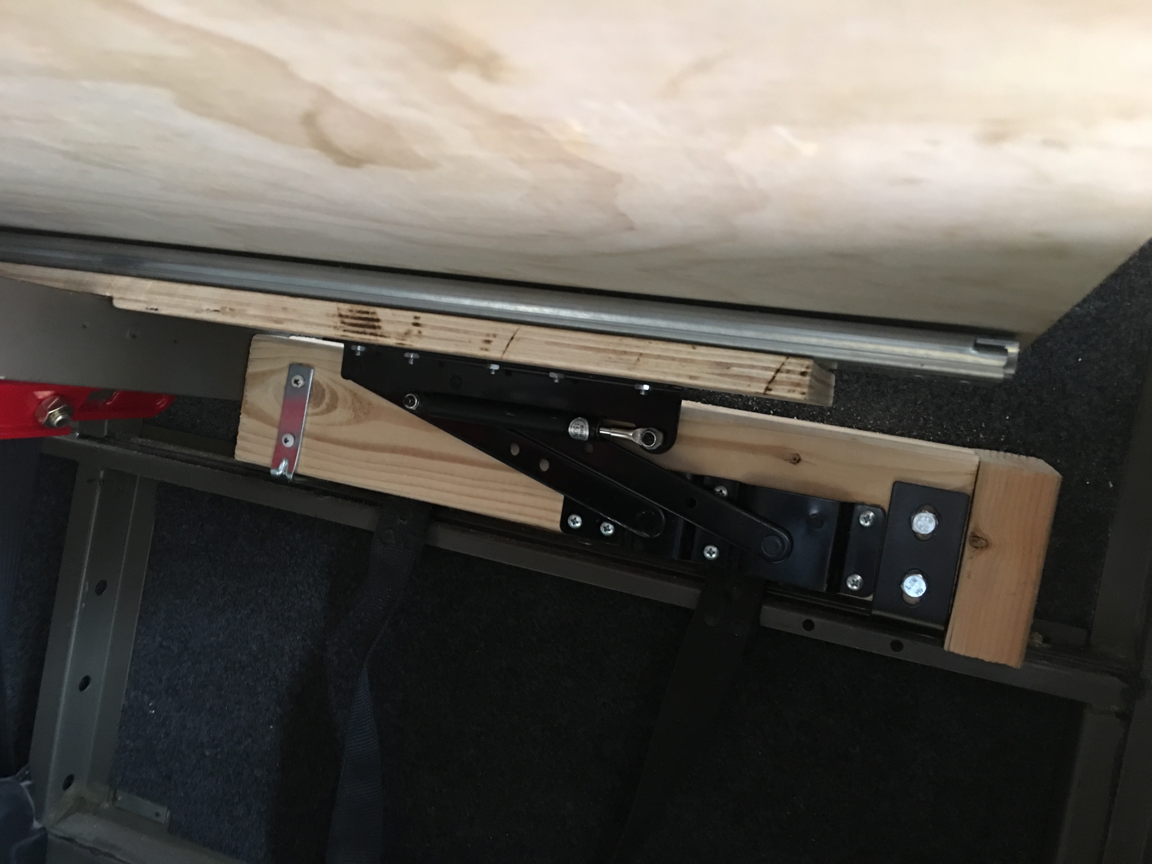 Sleeping platform now folds up and transforms into storage shelf when not in use lifting on gas struts and drawer slides. It now only takes about a minute to switch it back and forth.