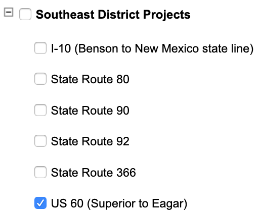 Once subscribed, scroll down to Southeast District Projects and check the US 60 (Superior to Eagar) checkbox.