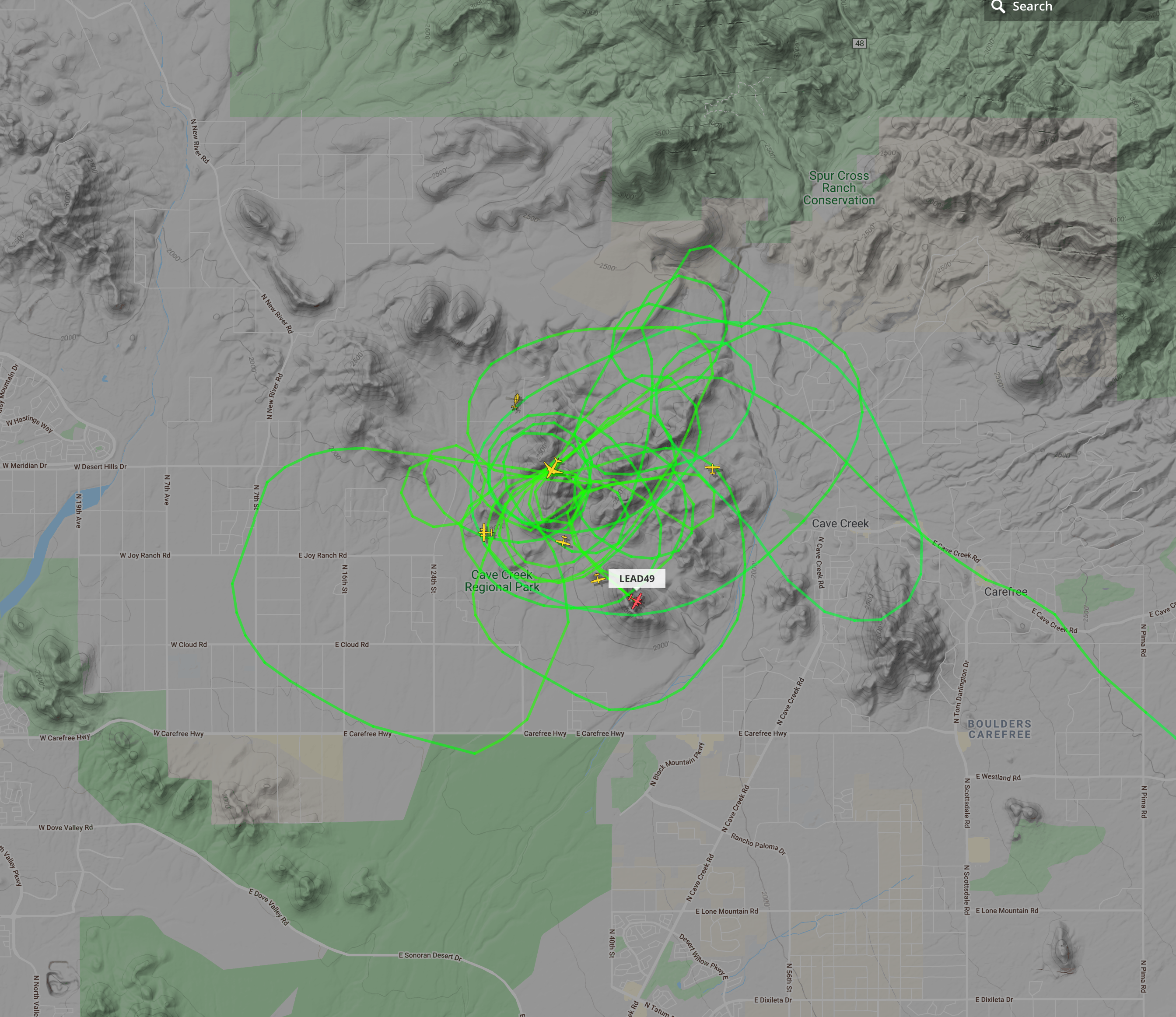 It appears there are about 8 aircraft (helicopter and fixed wing) working the fire. The fixed wing aircraft are making their stop at Mesa Gateway Airport (KIWA/AZA). It appears it takes about half an hour to do a drop flight.