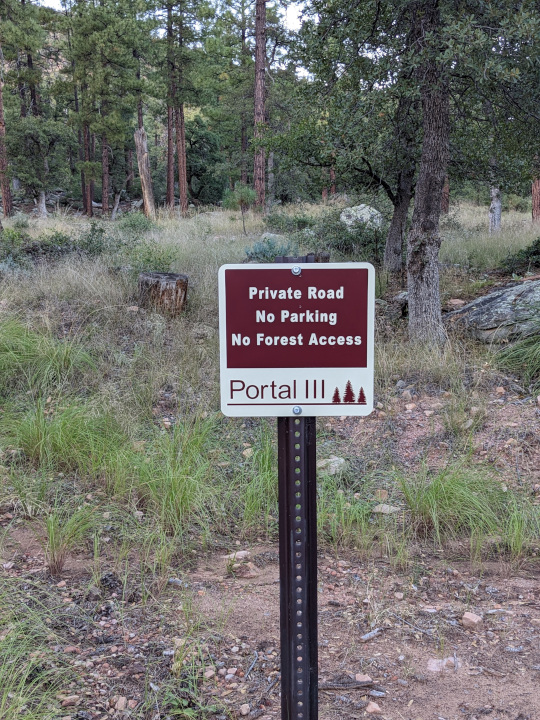 So these are deeded public roads that lead to the National Forest. All other roads in Portal 3 are private. The signs themselves likely violate Gila County Zoning ordinance, section 103.6-B : “Signs, other than traffic safety signage, will not be allowed in any existing or projected street, right of way, or street easement.”