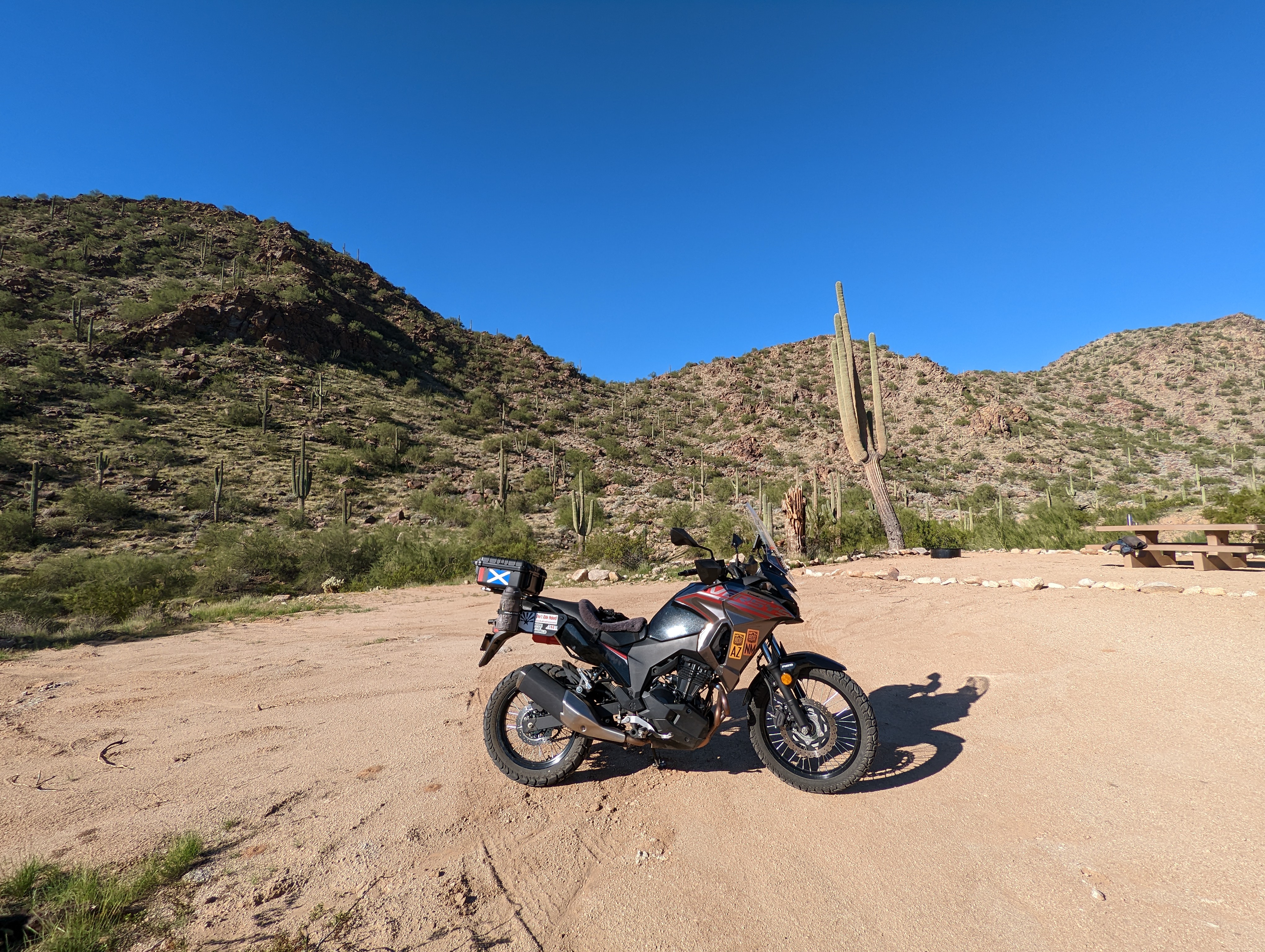 Deb and I headed to her favorite hiking area the N. Maricopas. We pulled off at the Estrella TH and Staging area and noticed the wire gate was gone and the two rut road was now a two lane wide graded road. A temp. sign said campsites and it looks like they started in Aug. We noticed starting two years ago that the area was beginning to open. New BLM road markers were showing up. Yesterday we hiked up into a canyon S. of Butterfield Pass. It was an awesome misty day with light sprinkles. When we got back to the FJ we decided to drive farther and see what the BLM did. There is another canyon we liked to hike that had an old two rut road, now it's graded single lane wide. It dead ends at what was once a popular camping spot but now gentrified. Spread out from each other are four camping areas with concrete picnic tables and steel fire rings. We've had mixed feelings about it slowly opening up because it has recovered nicely from over use. But our hiking distance has dropped in half the last two years so now we can get farther back into Deb's mountains. A GE photo from May of this year still shows it as a two rutter, but there is a truck parked where the new sites are. I've searched to no avail for info, maybe it's too new, but I'm sure Chumley will find a PDF on it...:)