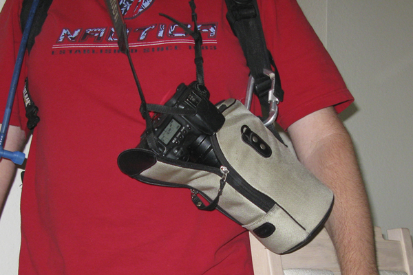 My next attempt involved a Tamrac digital top-loading case attached to the sternum strap on my pack. I found it made my chest too hot in summer hiking. My next solution was to put that same Tamrac case on my Riggers Belt (holster belt) that I wear with my smaller daypacks that don't have hip belts. In the summer I can't carry sufficient water and a tripod with these smaller daypacks. For non-hiking events & indoor events I love my Lowepro Slingbag. So with the Slingbag as my inspiration and lunacy as the mother of invention, I figured out a two carabiner system to attach my Tamrac toploader to my Osprey packs. I can unclip, unzip and whip it out real fast.