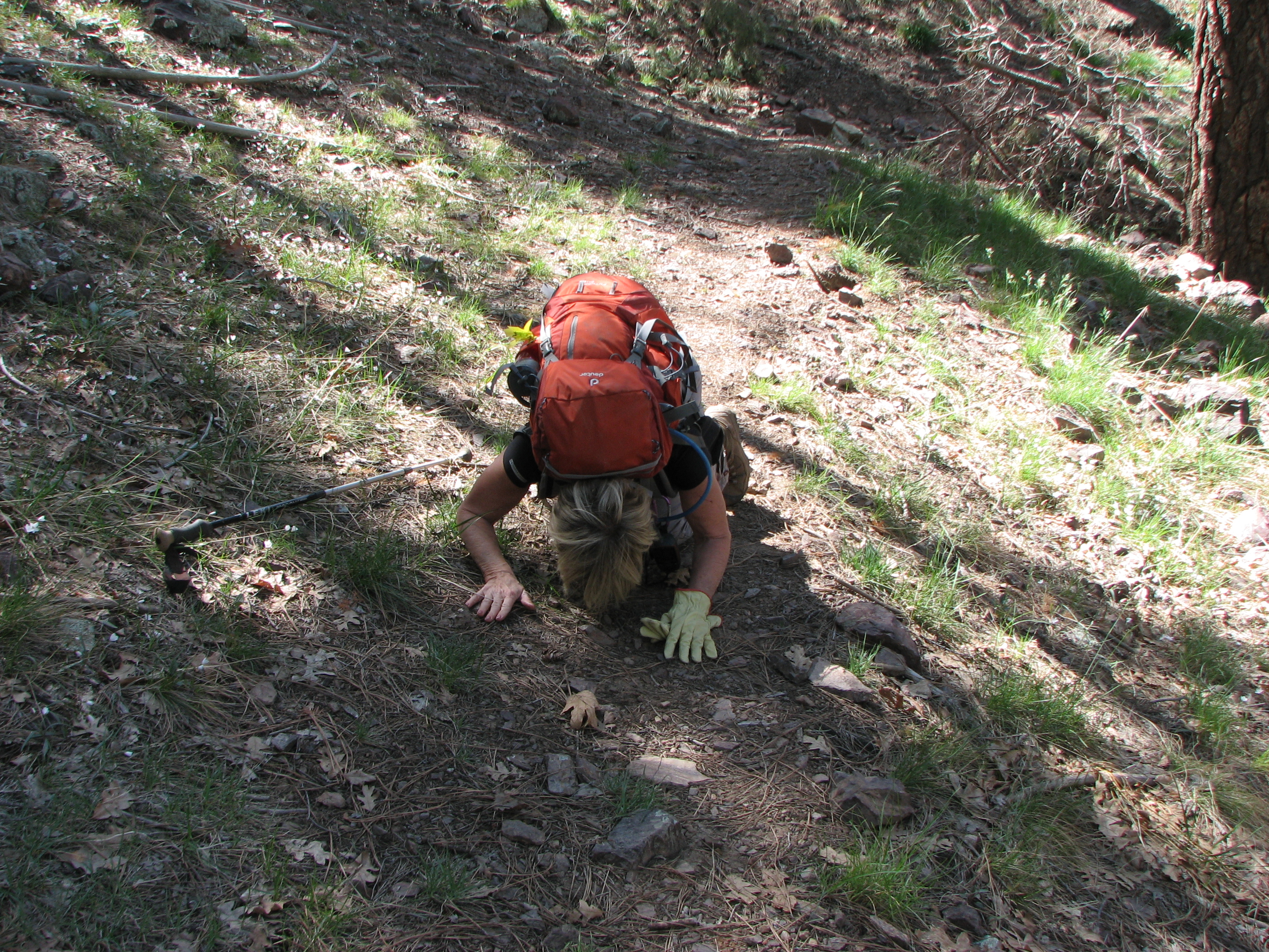 It was rough enough to just get to the area we wanted to search that I believe Gabriele is hanging up her off-trail bush-whacking boots. Here's how grateful Gabriele was to actually get back to a real trail: But with the additional first-hand information I know what the terrain is like to traverse and already am working out the best route for a return trip providing a maximum amount time for searching with the minimum of time used up just getting there. Unfortunately I'll be on a trip out-of-state until 4/25 so it looks like 4/26 or 4/27 will be my next attempt.