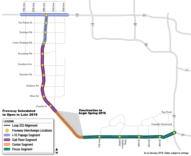 From the 60/I-10 junction in Tempe, the trip from the south is 10 miles shorter than from the north. It took me 5 minutes less time on the south route too, so mileage matches time pretty well.