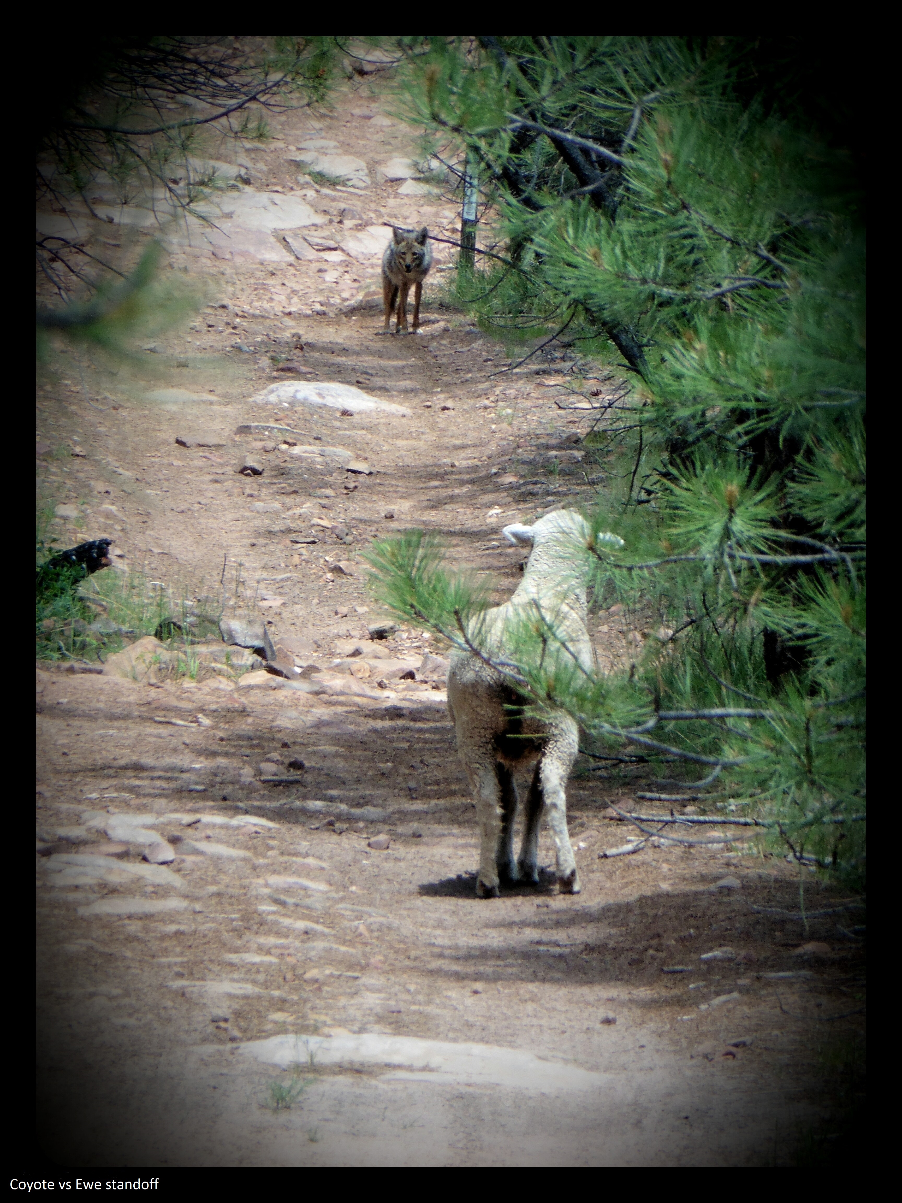 A couple years ago DbleDutch team were hiking east of Larson Ridge when a pair of BIG sheep came crashing out of the brush towards us. At first they looked like Hereford cattle. They ambled down the trail ahead of us and we dropped back about 100'. Suddenly a coyote crossed the trail between us and headed left of the picture. We knew something was going to happen and stood silent, while I fished my camera out. Wiley re-entered the trail ahead of the sheep for a faceoff. The one sheep said "meh" and walked off the trail and laid down, the other stood center of the trail and stomped its front hooves on occasion as if to say "bring it". This lasted at least a minute until I stepped left to avoid a pine branch for the pic. Wiley said this was enough and exited right, quickly.