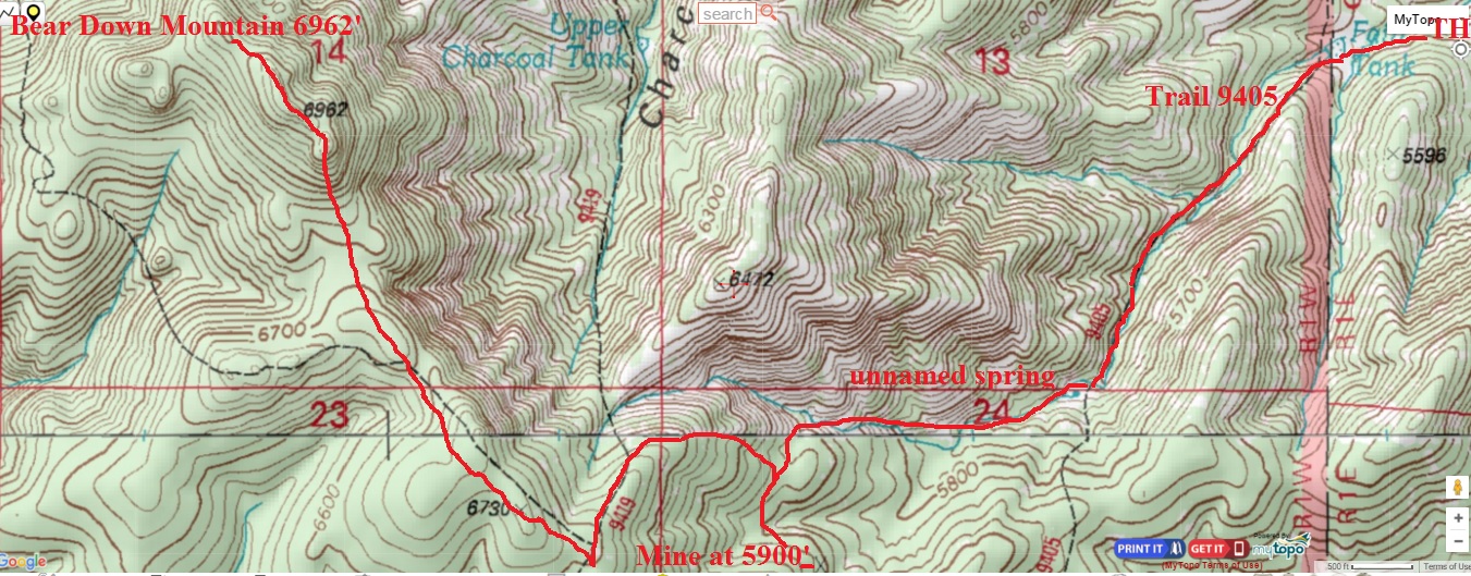 For this journey, we will launch from a residential area in Dewey-Humboldt off of East Shirley Lane. Satellite imagery shows a trail or path that connects to Trail #9405 by Fain Tank. From the water tank we will hike southwest on #9405 for a brief jaunt then into the first drainage then right/west and UP to an unnamed mine. Satellie imagery shows trail in the drainage, then up an east ridgeline until we connect with trail 9419 then it junctions with an unnamed trail which is on topo maps and aerial imagery. We stay on this unnamed trail for about 3/8ths of a mile then banking north-northwest (staying on the south ridgeline) towards Bear Down Mountain summit which is another 5/8ths of a mile. Taped off route on Google Earth shows an estimated 3.34 miles one-way with an estimated 2001' in elevation gain. Get some.